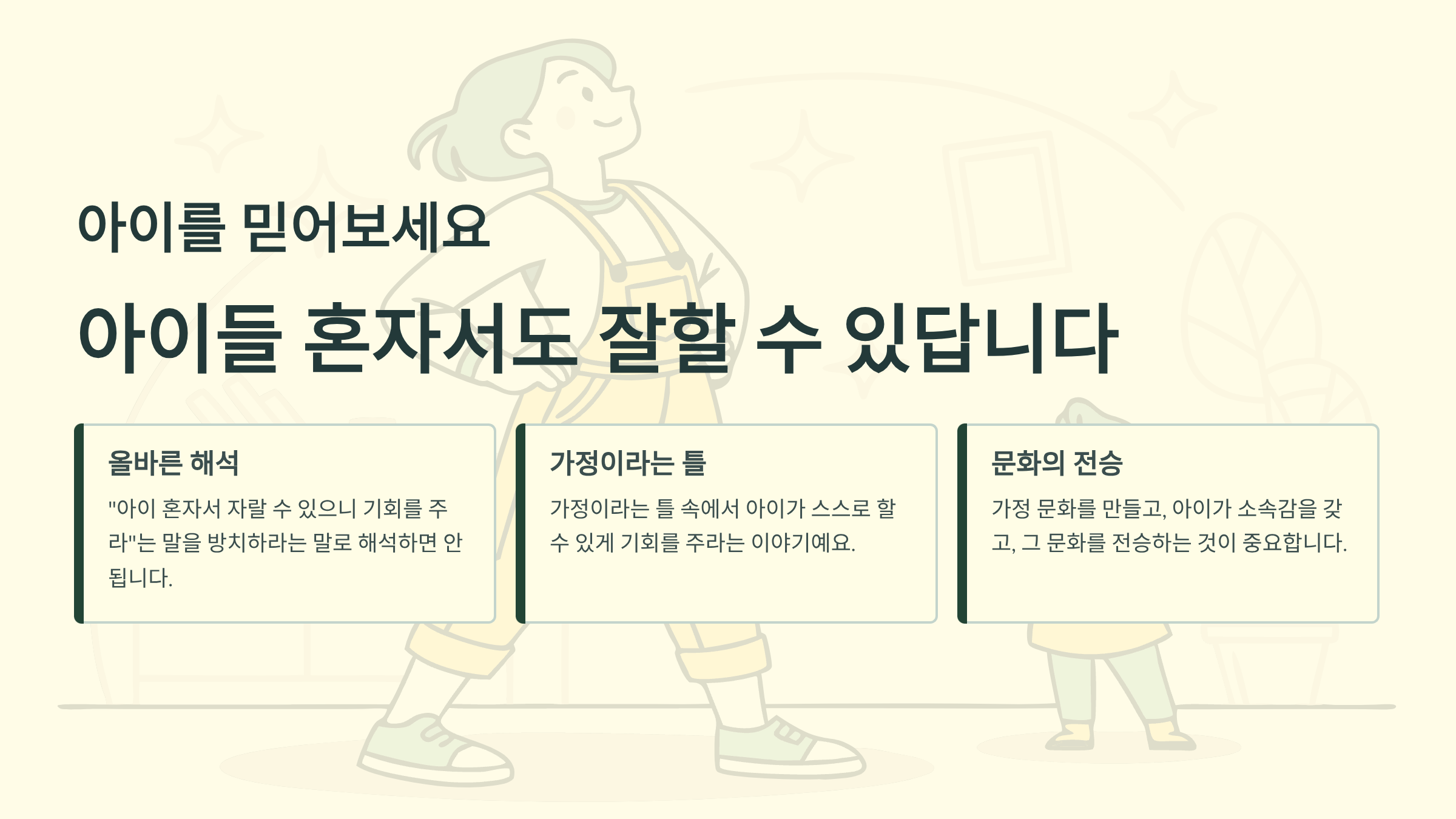 부모가 지금처럼 모든 것을 다 해주고 대신 해주고 도와주지 않아도, 가정의 일상을 경험하면서 아이들은 혼자서도 잘 자랄 수 있어요.