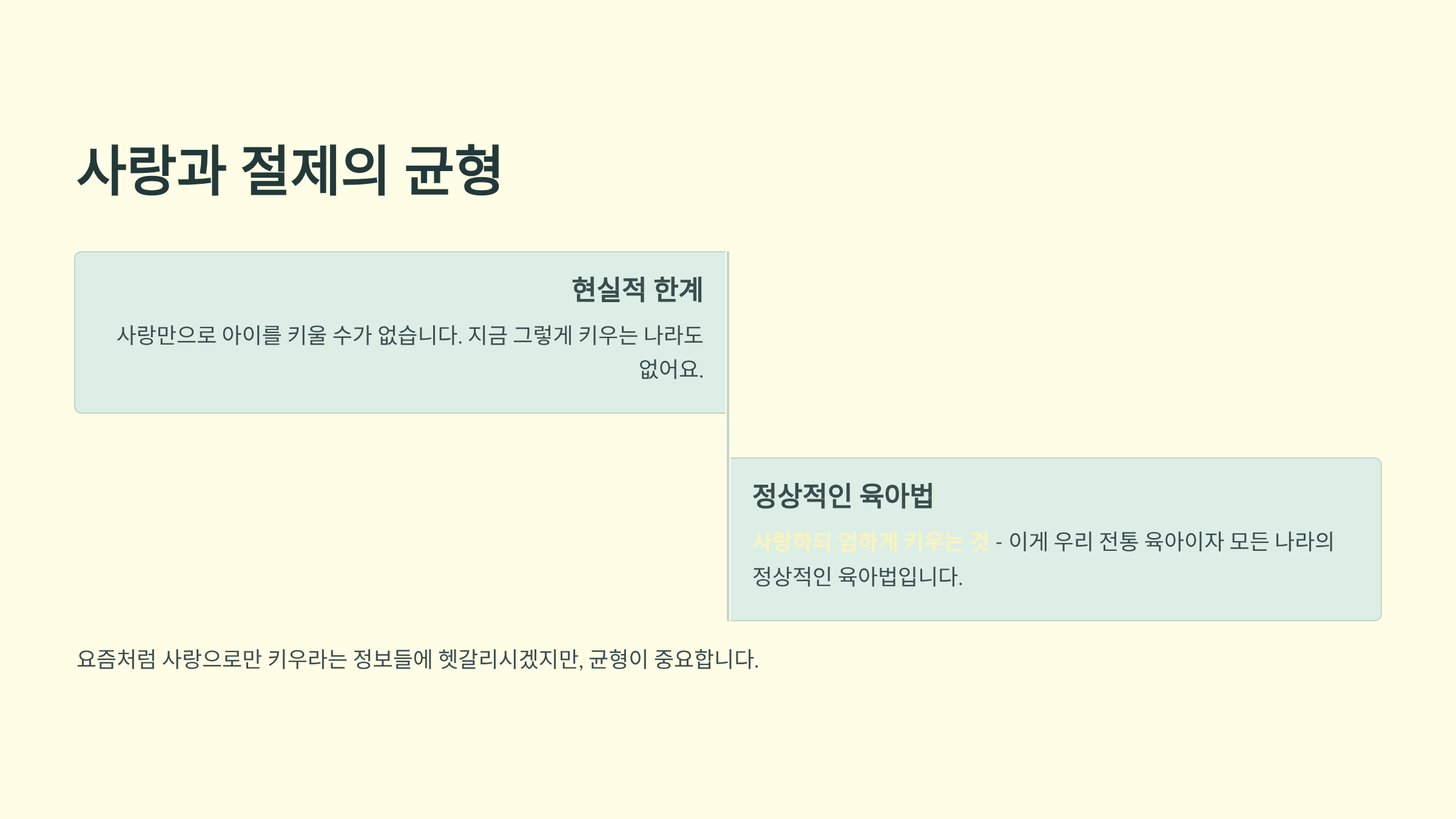 요즘처럼 사랑으로만 아이를 키우라는 수많은 정보들을 듣고 있는 부모들에게는 참으로 헷갈리는 소리가 아닐 수 없어요.