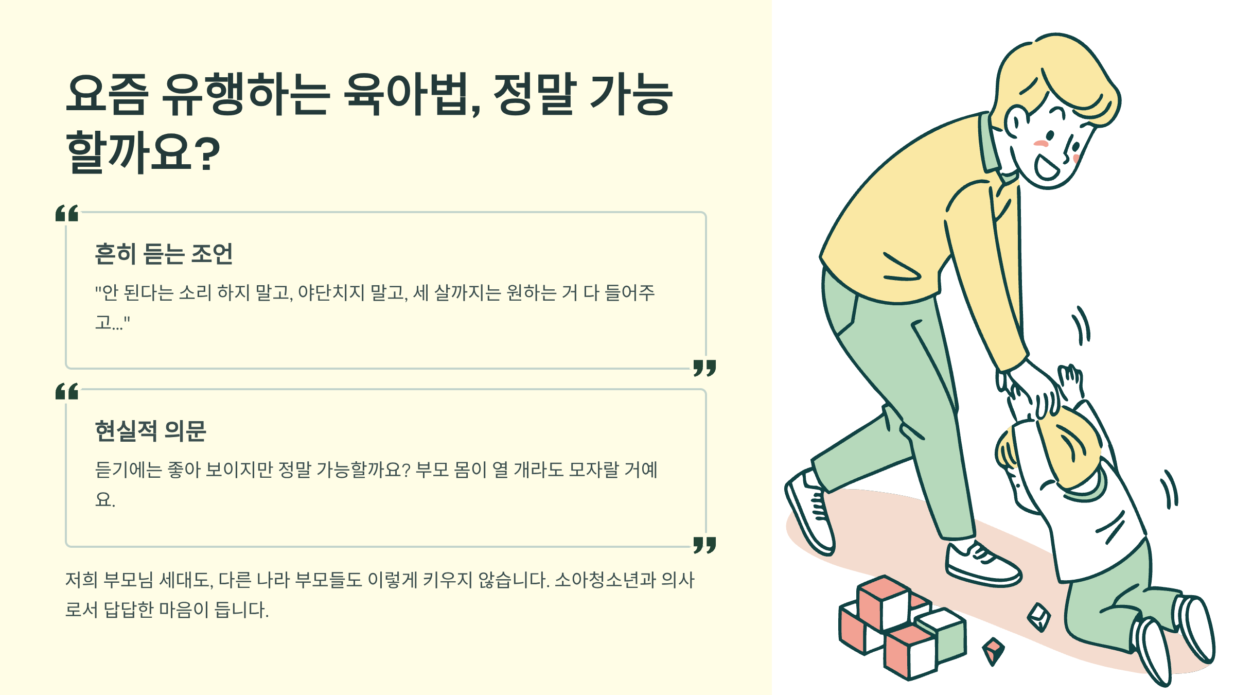 저희 부모님 세대는 저를 이렇게 키운 적 없어요. 그리고 현재 다른 나라의 부모들도 아이를 이렇게 키우지 않습니다. 듣기에는 참으로 좋은 육아법 같아 보이지만, 정말 가능하다고 생각하시나요?