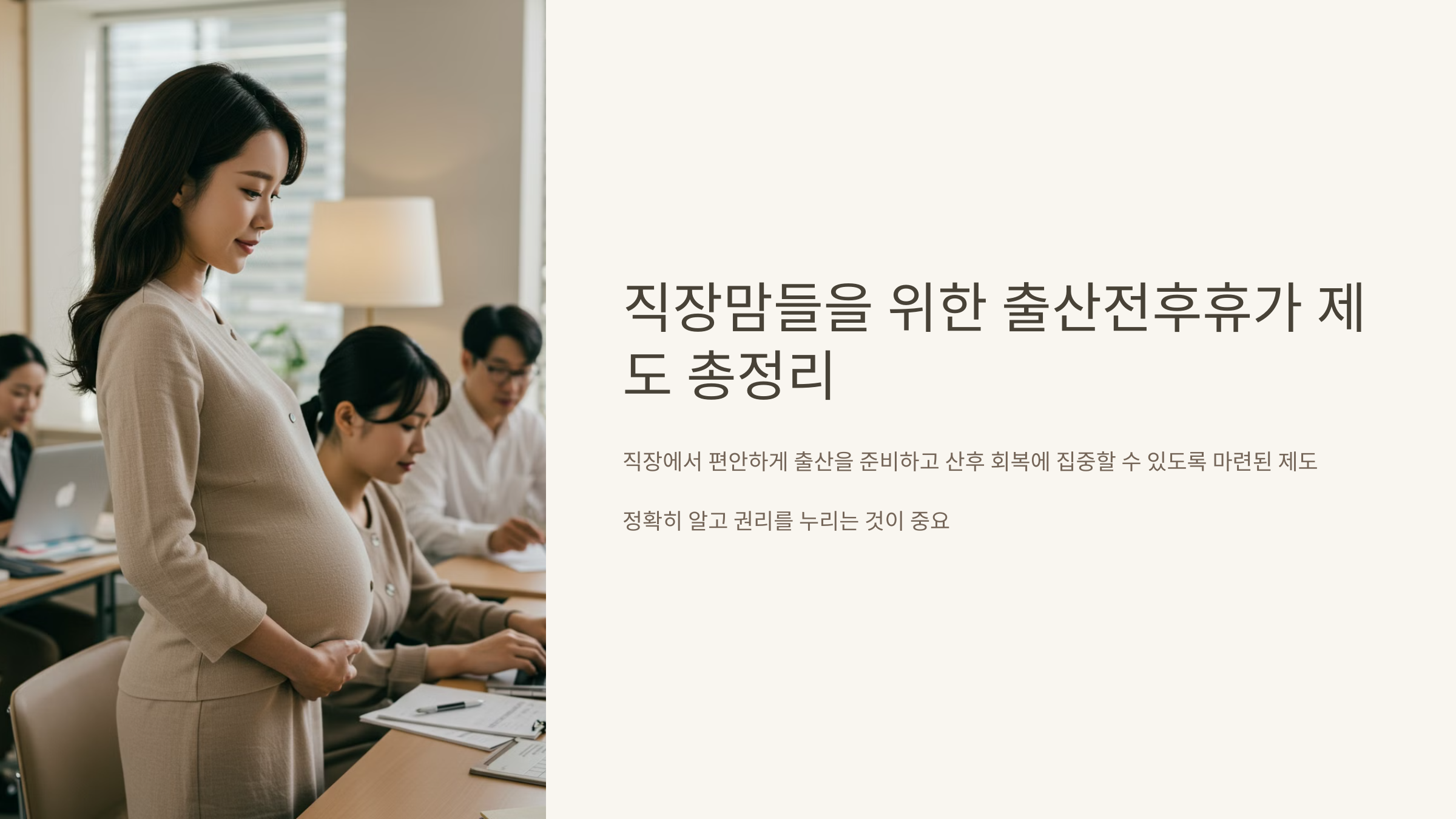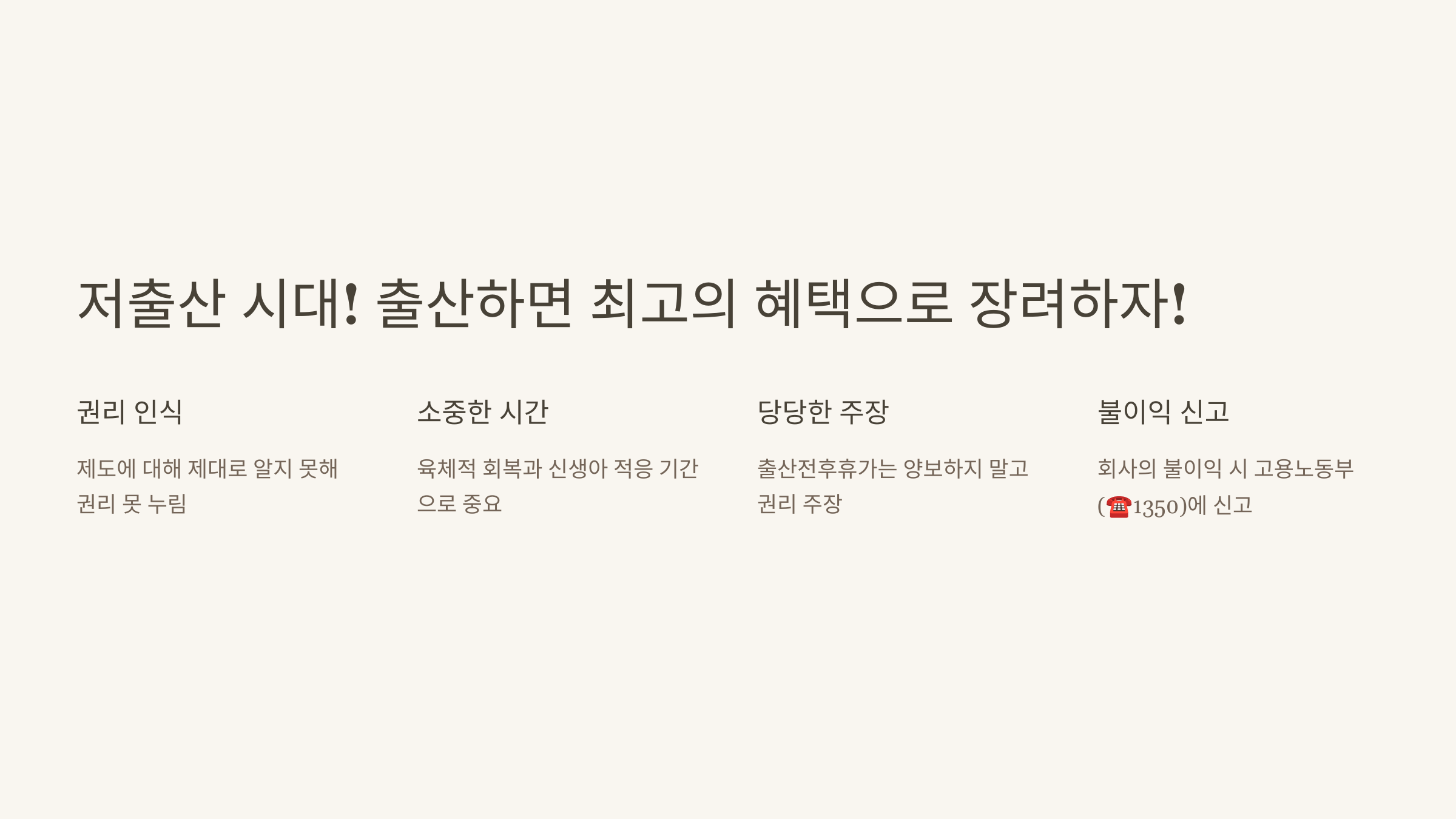 여러분도 출산전후휴가는 양보하지 마세요! 당당하게 권리를 주장하고, 회사가 불이익을 주려 한다면 고용노동부(☎1350)에 바로 신고하세요. 우리 모두의 권리가 지켜질 때 더 행복한 직장맘 생활이 가능하니까요!