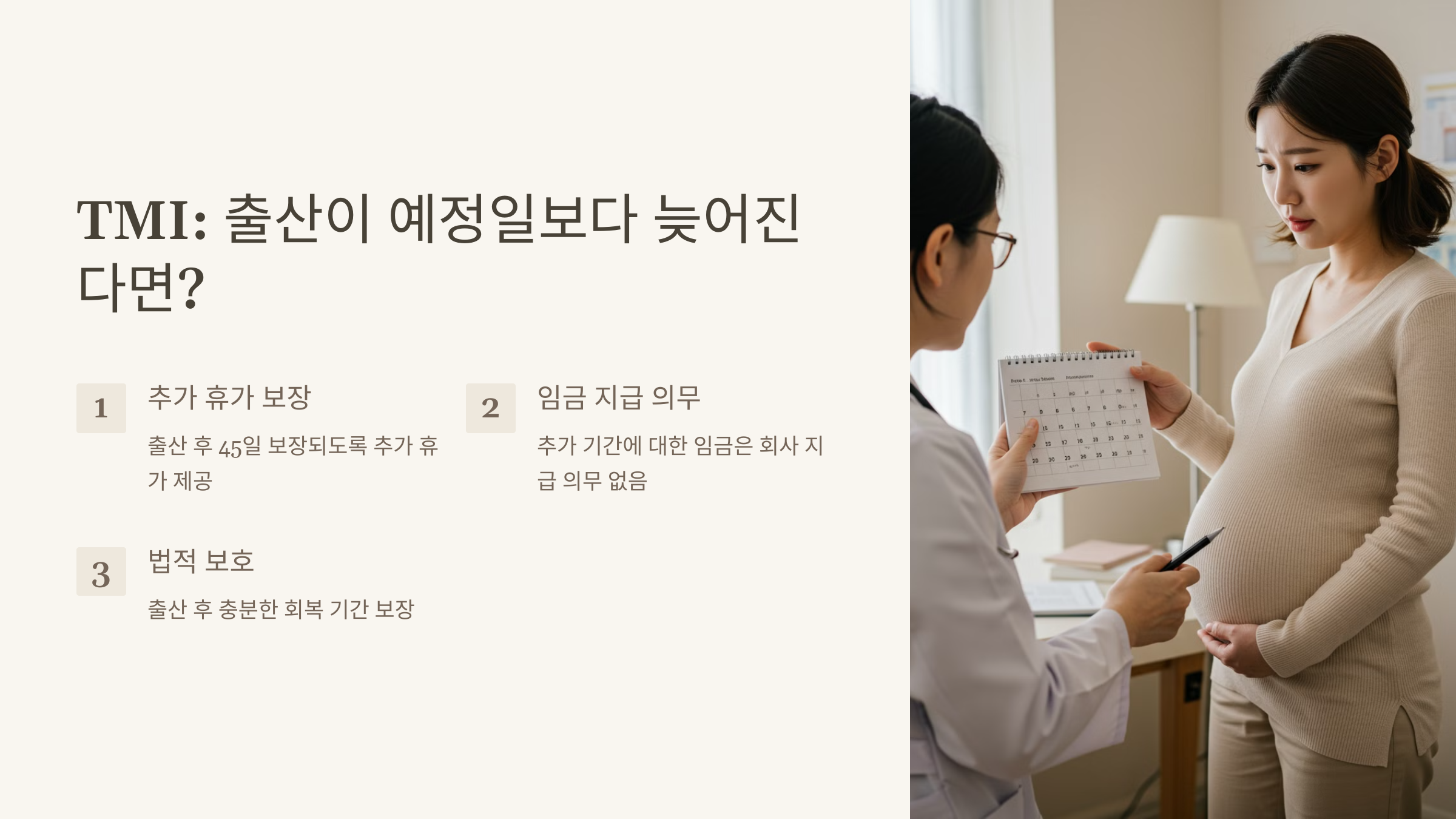 출산이 생각보다 늦어져서 출산 후 45일을 못 채우게 된다면? 걱정 마세요! 사업주는 반드시 출산 후 45일이 보장되도록 추가 휴가를 더 줘야 해요. 다만, 추가 기간에 대한 임금은 회사가 지급할 의무는 없어요.