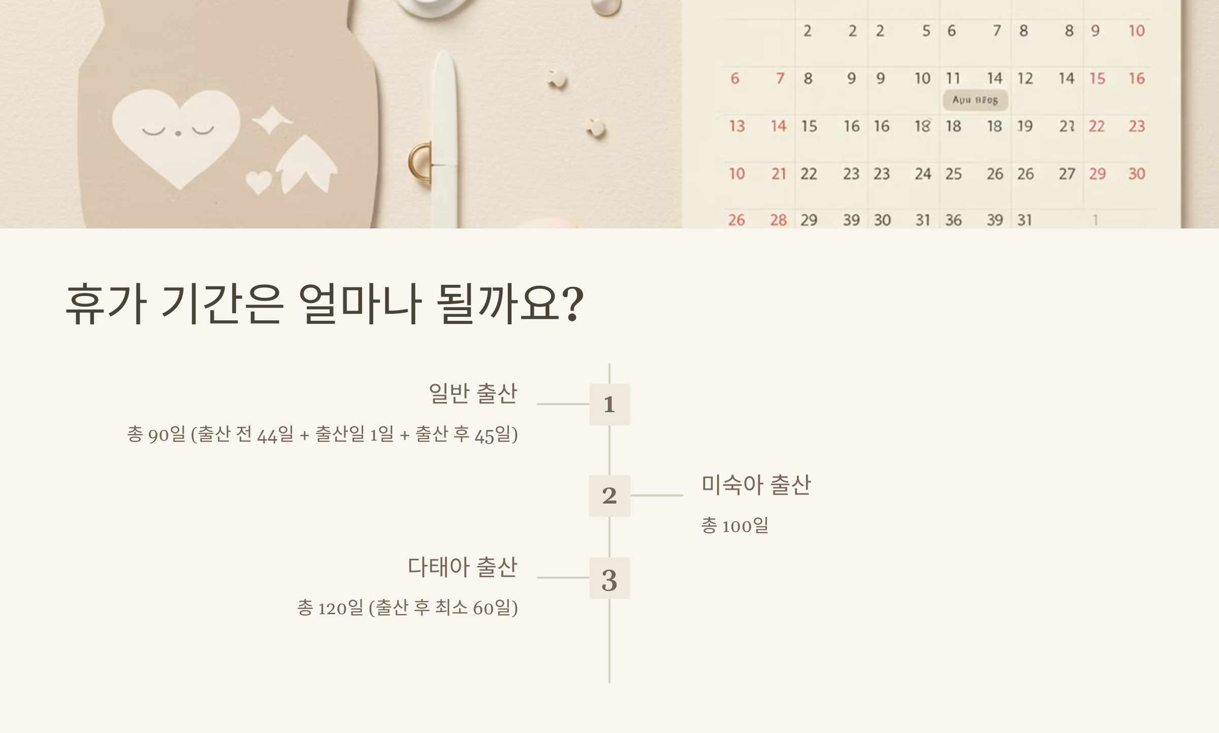 일반 출산: 총 90일 (출산 전 44일 + 출산일 1일 + 출산 후 45일)