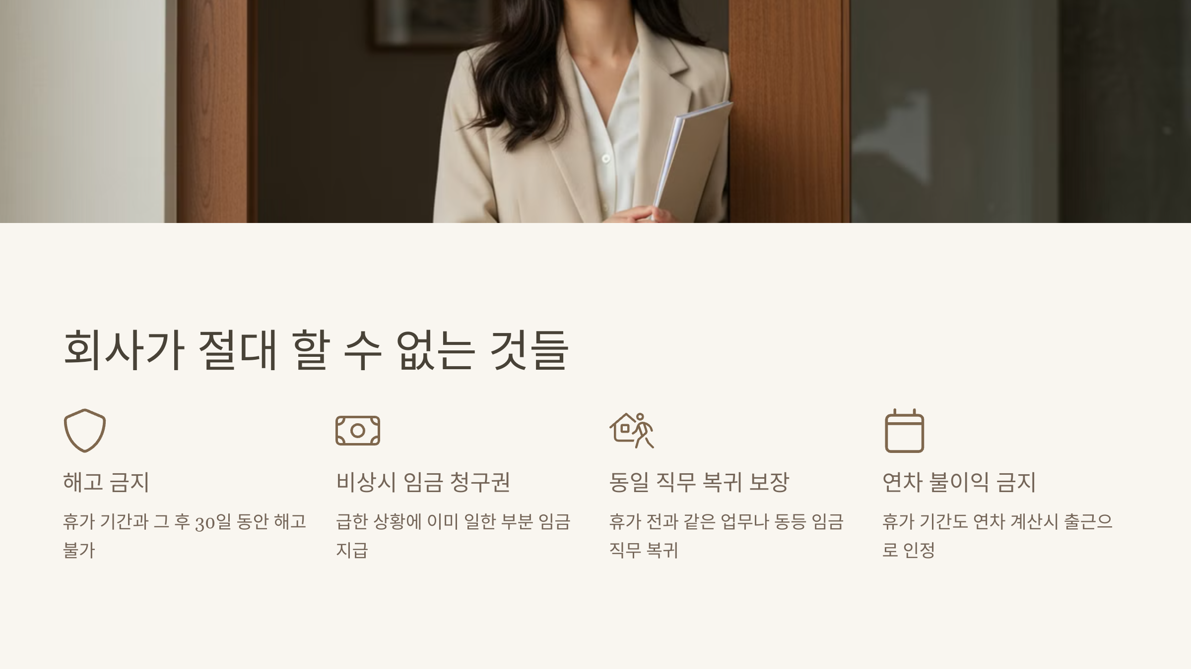 해고 금지: 출산전후휴가 기간과 그 후 30일 동안은 절대 해고할 수 없어요. (회사 폐업 등의 예외 경우 제외)