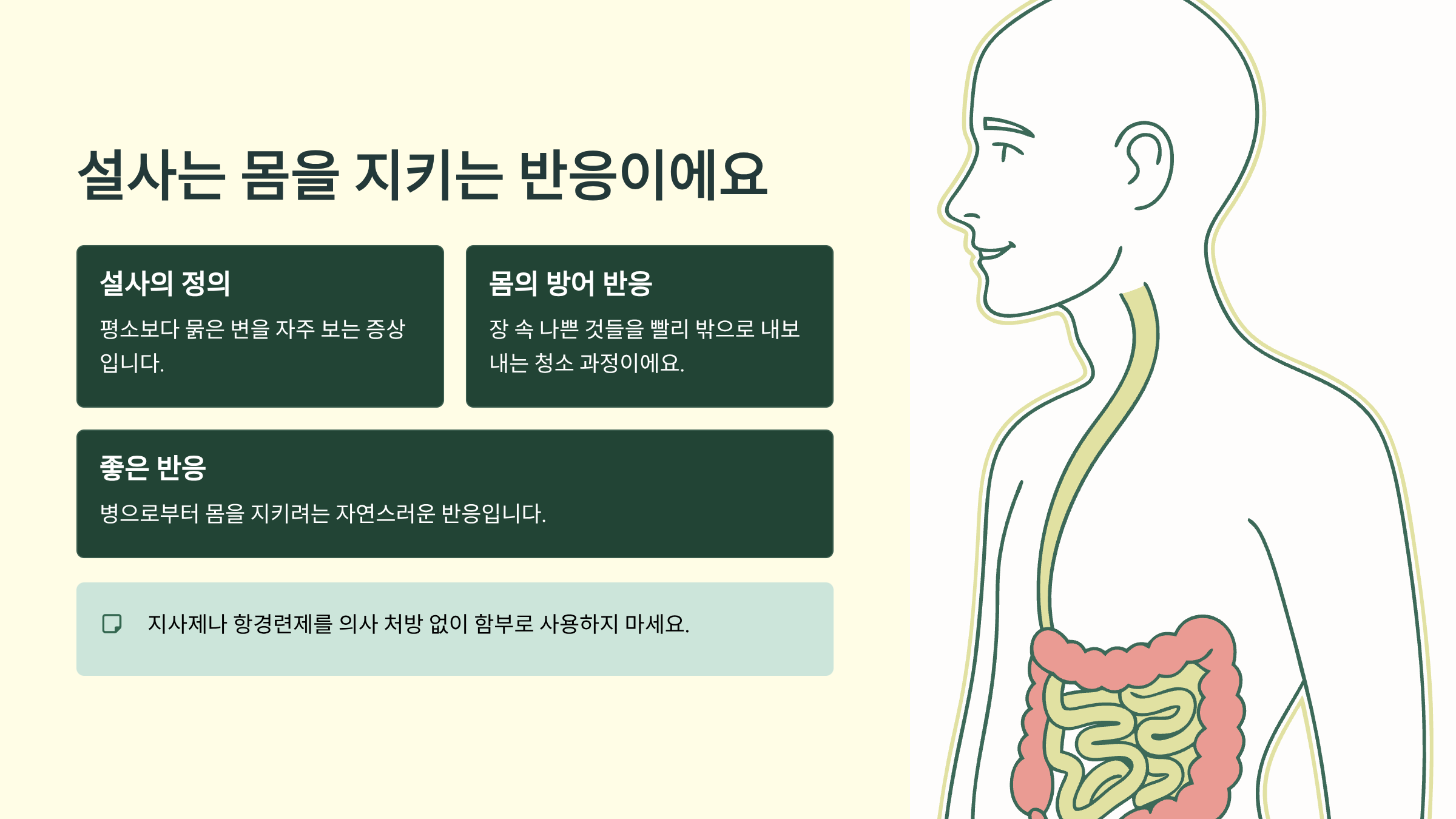 놀랍게도 설사 그 자체는 설사를 일으키는 병으로부터 우리 몸을 지키는 역할을 해요. 그래서 우리 몸에 좋은 반응이라고 할 수 있죠. 설사를 일으키는 병을 빨리 좋아지게 하려고 설사를 하는 거예요.
