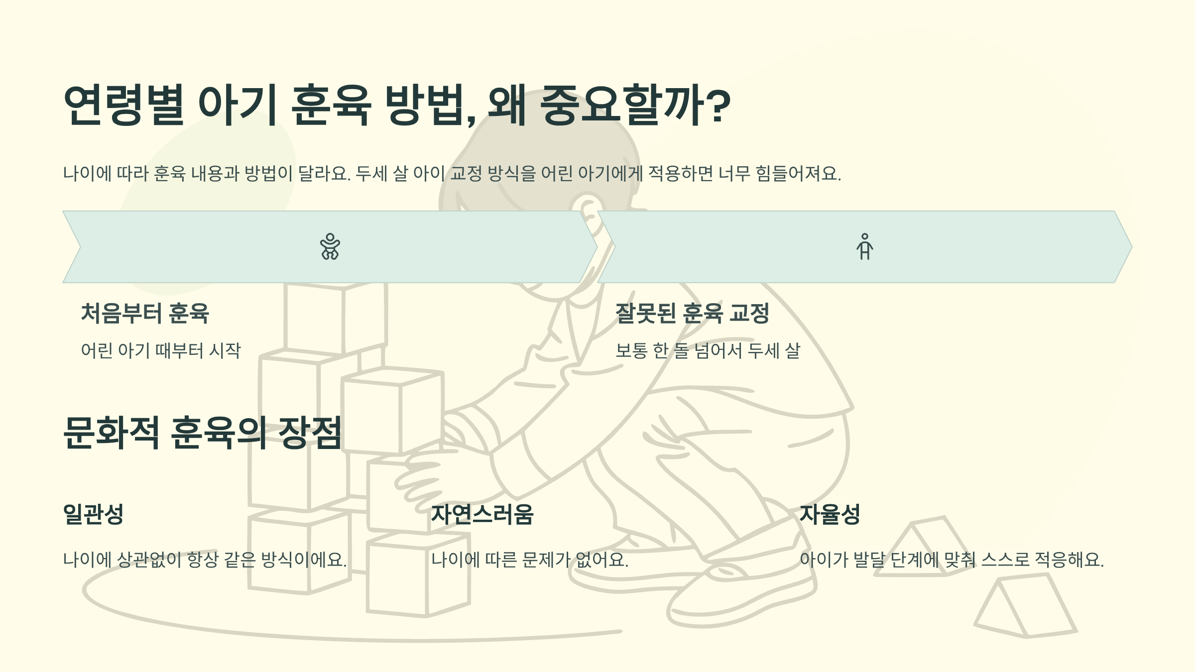 안녕하세요. 오늘은 많은 부모님들이 헷갈려하시는 내용을 다뤄보려고 해요. 바로 처음부터 하는 아기 훈육과 이미 잘못된 훈육을 교정하는 방법이 완전히 다르다는 사실이에요.