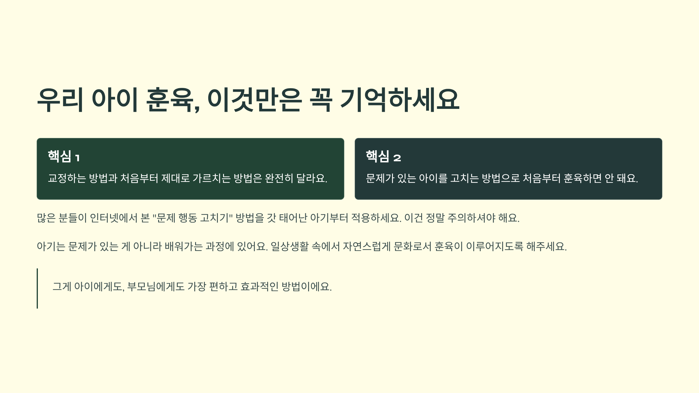 교정하는 방법과 처음부터 제대로 가르치는 방법은 완전히 다르다는 거예요. 그리고 문제가 있는 아이를 고치는 방법으로 처음부터 훈육하면 안 된다는 거죠.