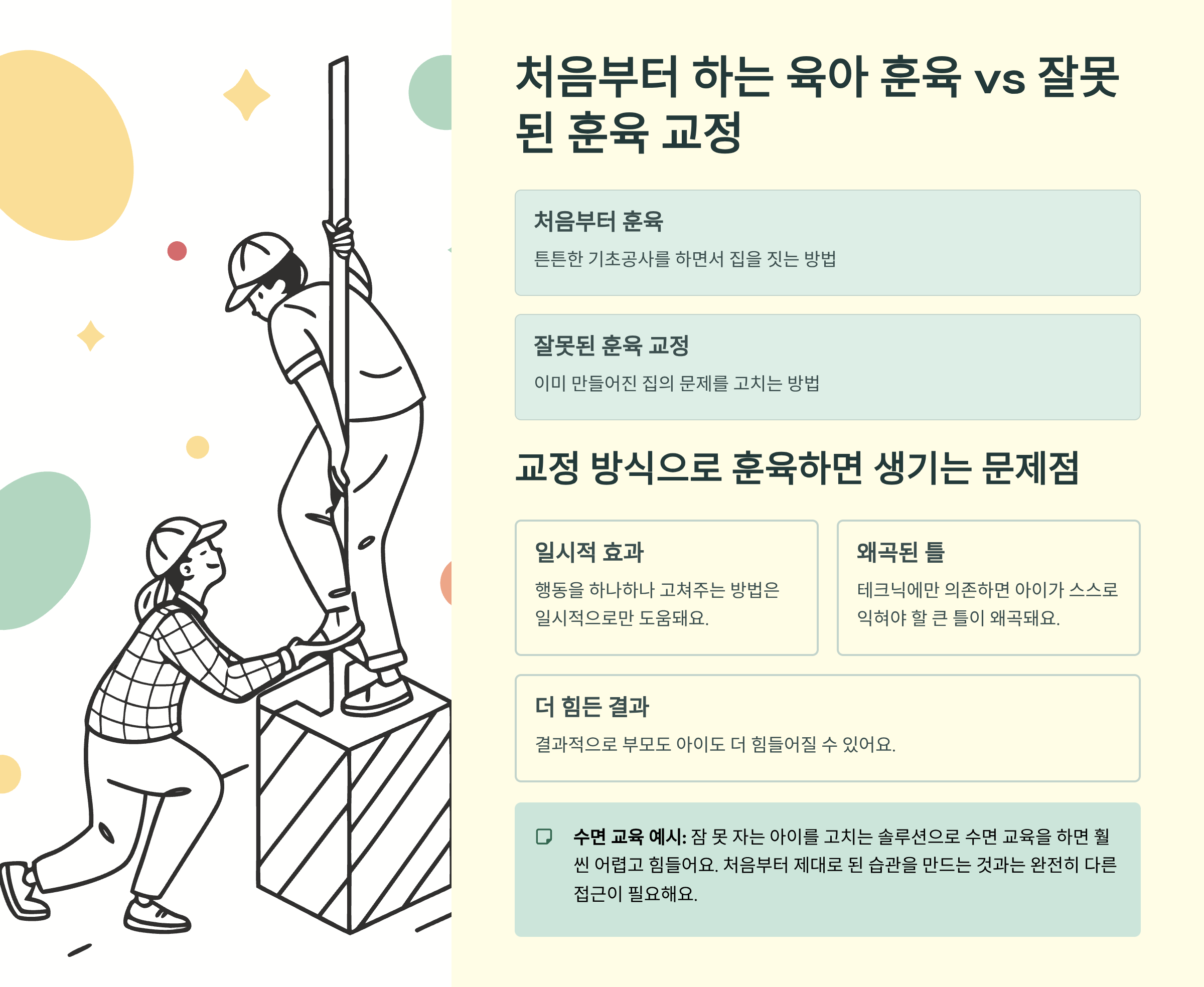 예를 들어볼게요. 처음부터 튼튼한 기초공사를 하면서 집을 짓는 방법과, 이미 만들어진 집의 문제를 고치는 방법은 완전히 다르잖아요? 훈육도 마찬가지예요.