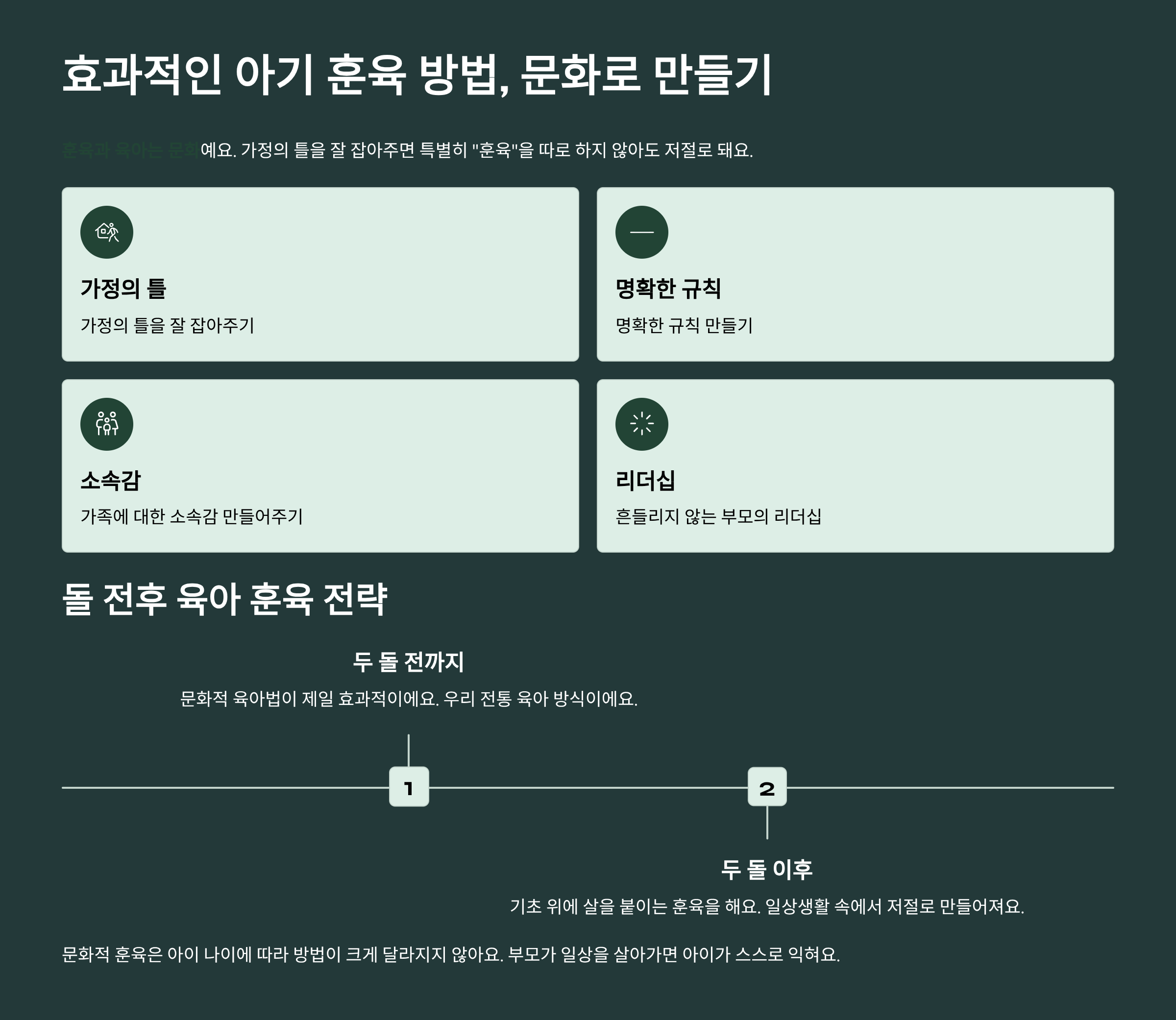 두 돌 전까지는 문화적 육아법이 제일 효과적이에요. 우리 전통 육아 방식이기도 하고, 지금 대부분 나라에서 이런 방식으로 훈육하고 있어요.