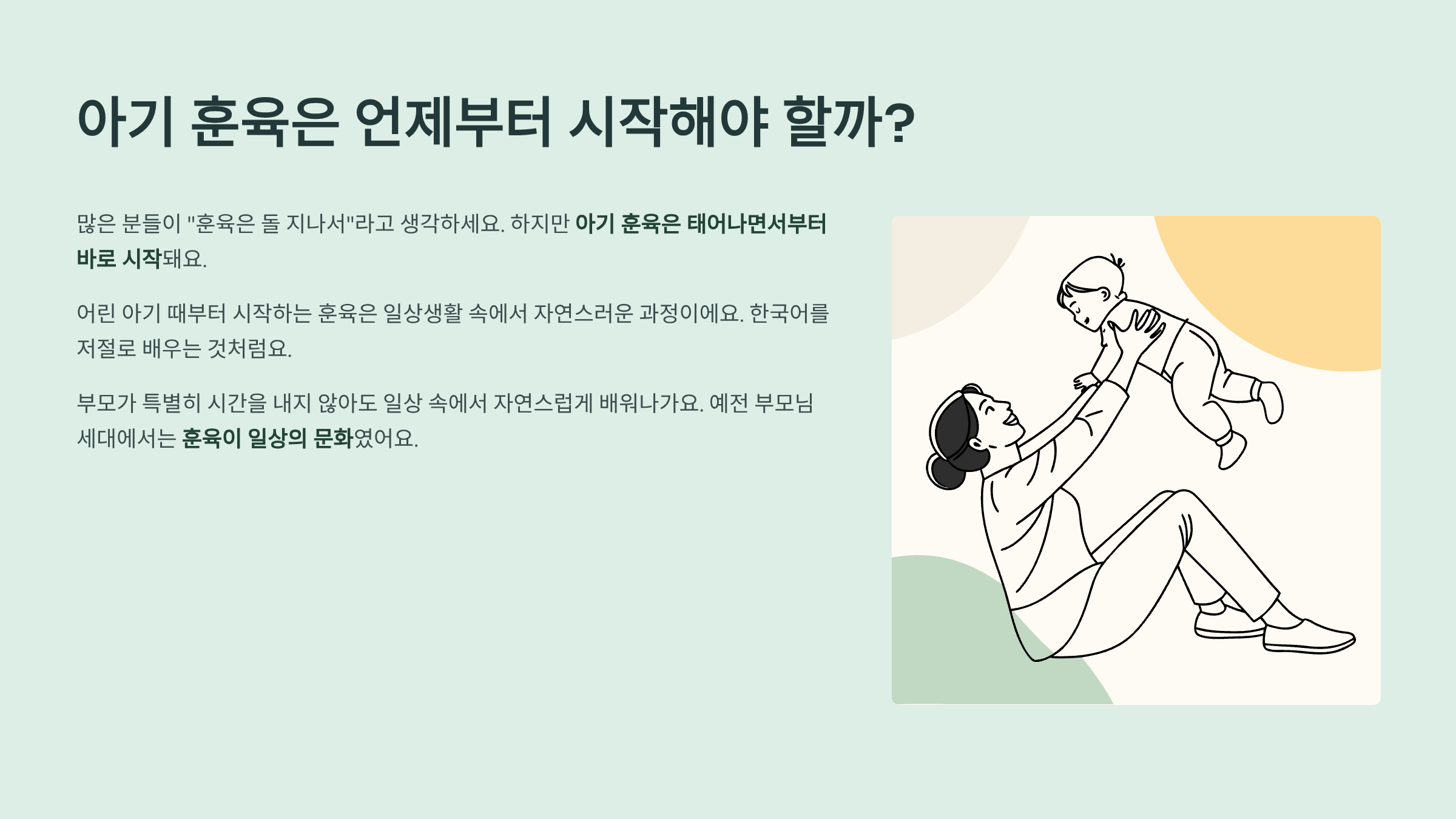 어린 아기 때부터 시작하는 훈육은 일상생활 속에서 아이가 스스로 익히는 자연스러운 과정이에요. 마치 한국에서 태어난 아이가 한국어를, 미국에서 태어난 아이가 영어를 저절로 배우는 것처럼 말이에요. 부모가 특별히 "오늘은 훈육을 해야지!"라고 따로 시간을 내지 않아도, 일상 속에서 자연스럽게 배워나가는 거죠.
