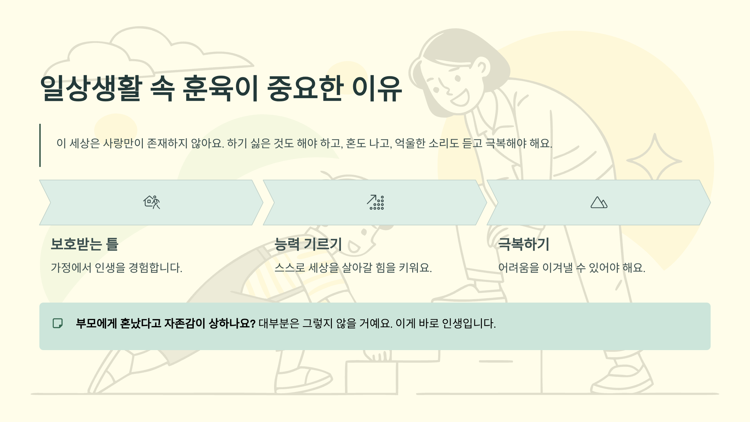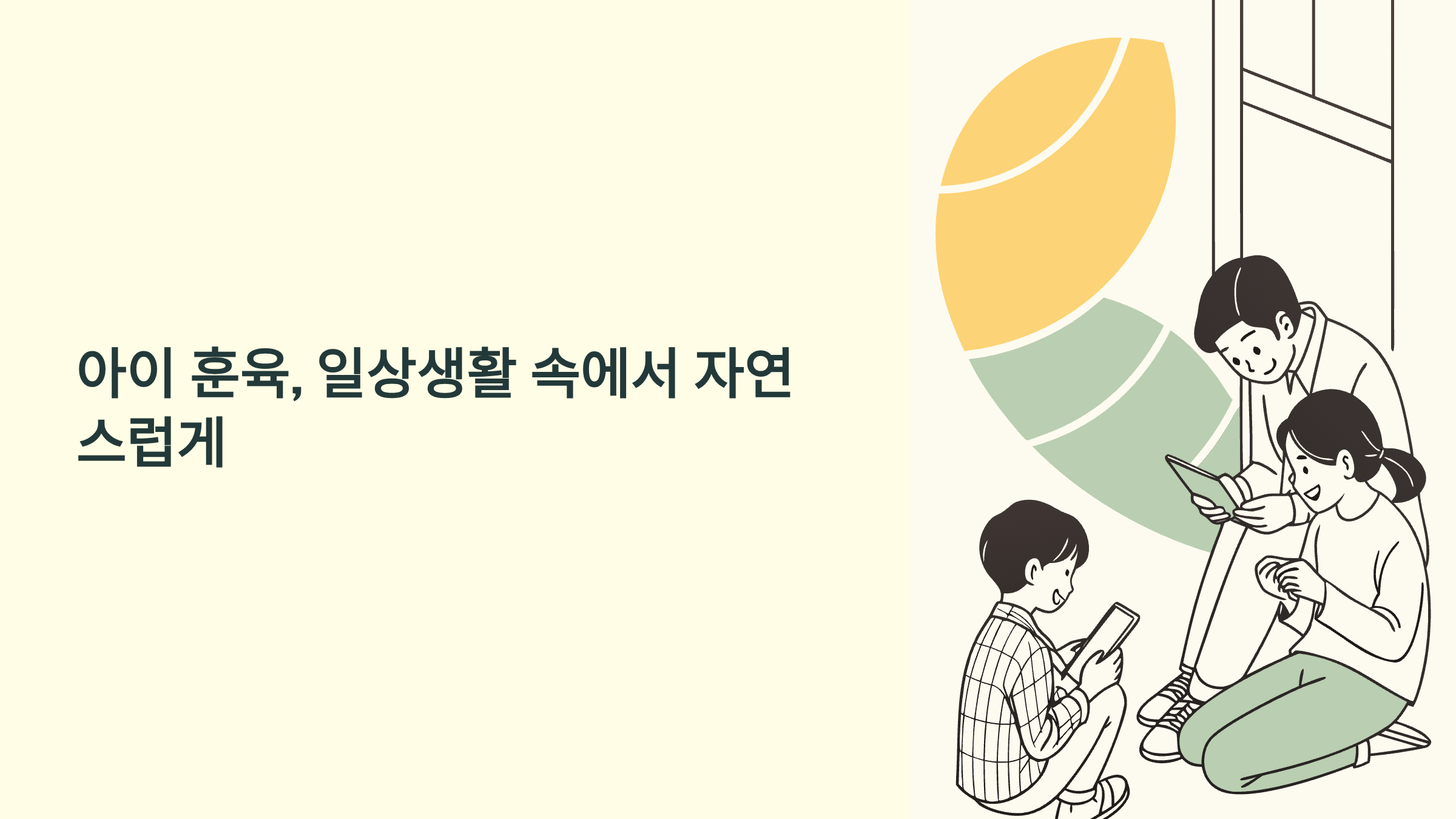 안녕하세요! 오늘은 많은 부모님들이 궁금해하시는 훈육에 대해 이야기해볼까 해요. 훈육이라고 하면 뭔가 특별한 방법이나 기술이 필요할 것 같지만, 사실은 우리의 일상생활 속에 답이 있답니다.