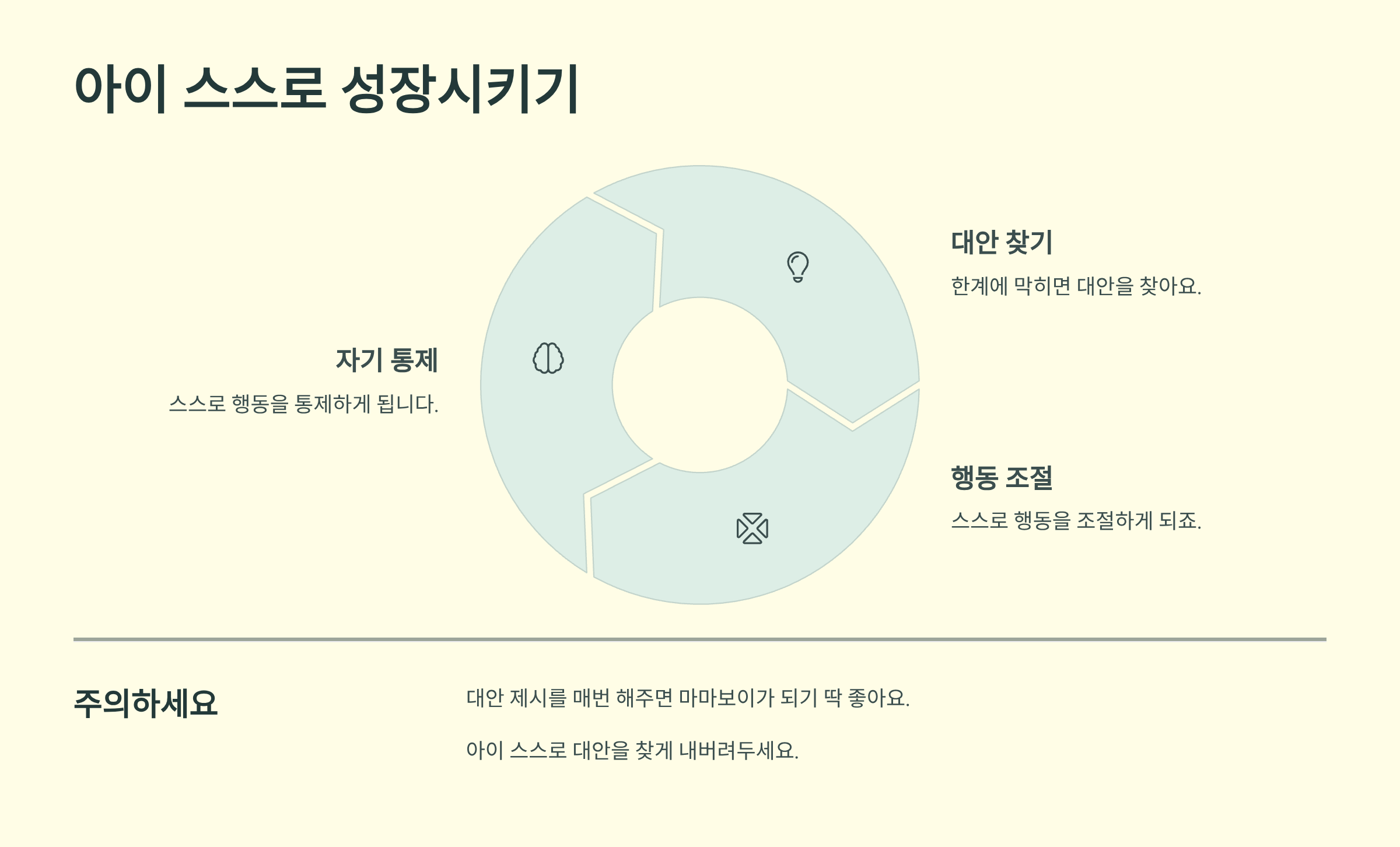 대안 제시 같은 건 일상 육아에서 하지 않는 게 좋아요. 한두 번은 괜찮지만, 매번 해주면 아이 스스로 대안을 찾지 못하는 마마보이가 되기 딱 좋거든요. 아이 스스로 대안을 찾게 내버려두세요. 그게 바로 인생이랍니다.