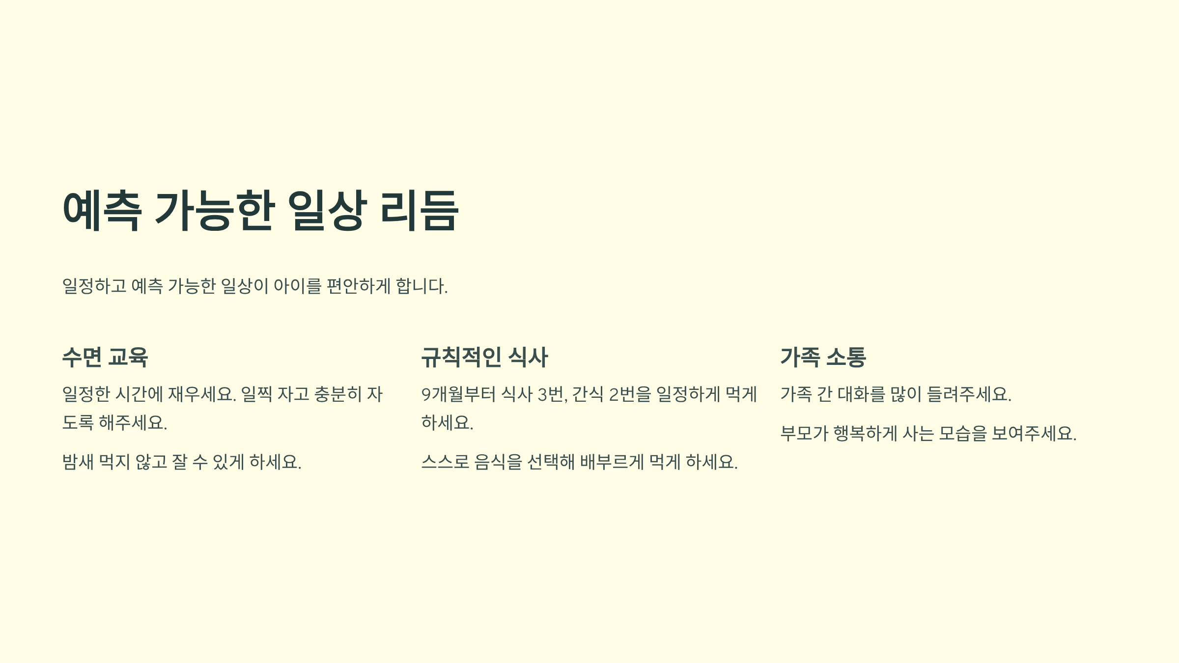 항상 일정하고 예측 가능한 일상생활을 하면 아이들은 편안하게 이런 것들을 훨씬 쉽게 받아들일 수 있어요.