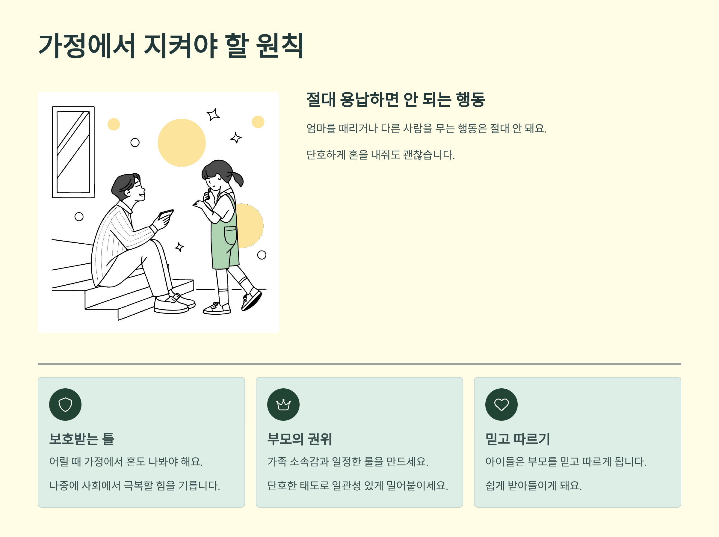 만일 이런 내용이 여러분의 일상생활 속에 없거나 부족하다면, 훈육을 하겠다는 생각보다는 정상적인 가정의 일상생활을 복원하는 게 우선이에요. 일상을 복원하시면 훈육은 저절로 되는 거랍니다.