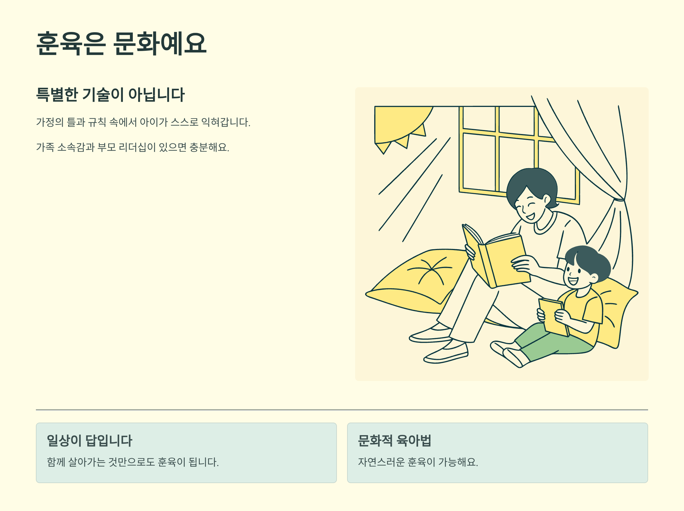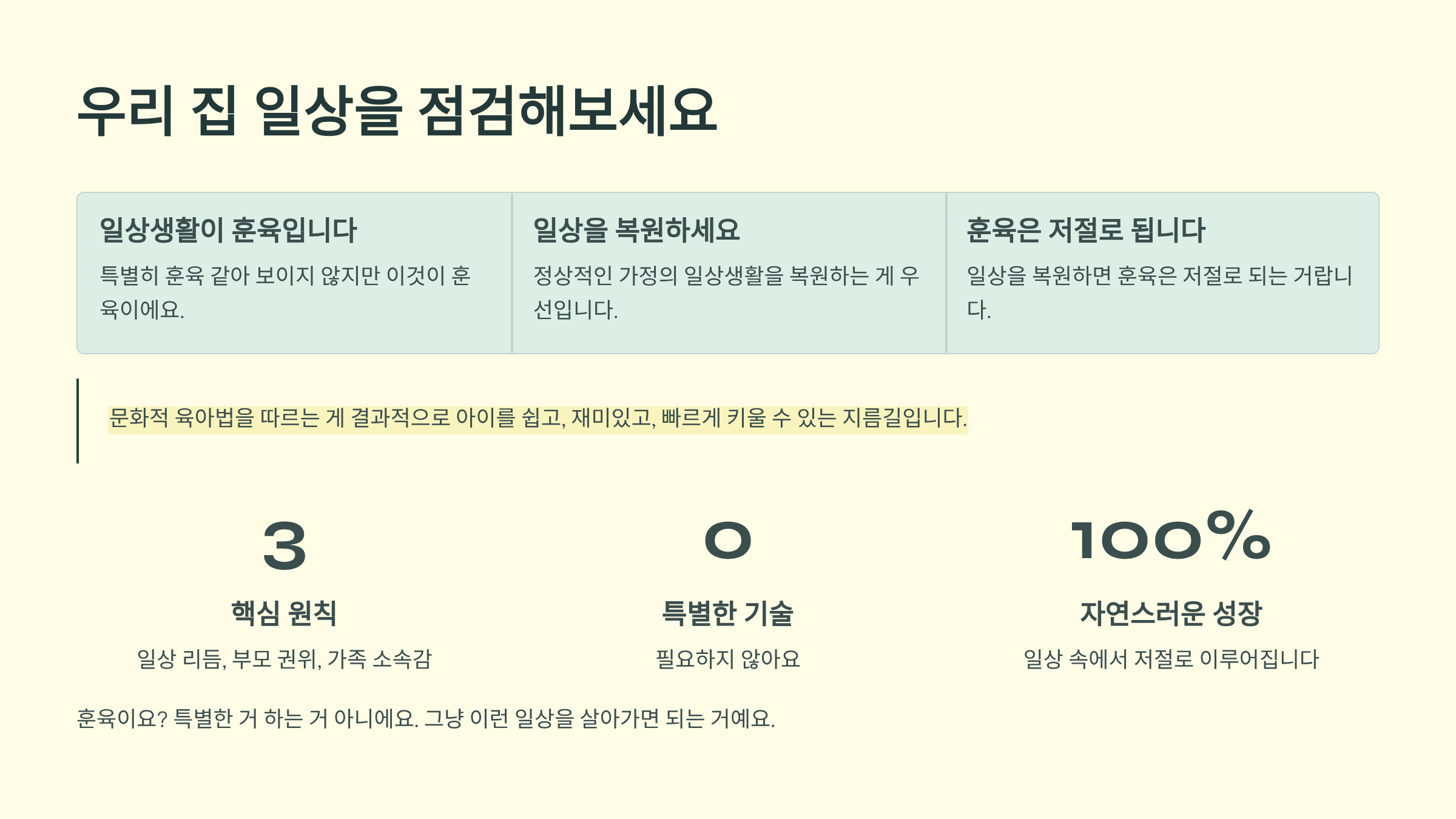 훈육이요? 특별한 거 하는 거 아니에요. 그냥 이런 일상을 살아가면 되는 거예요. 문화적 육아법을 따르는 게 결과적으로 아이를 쉽고, 재미있고, 빠르게 키울 수 있는 지름길이라는 것, 꼭 기억해주세요.
