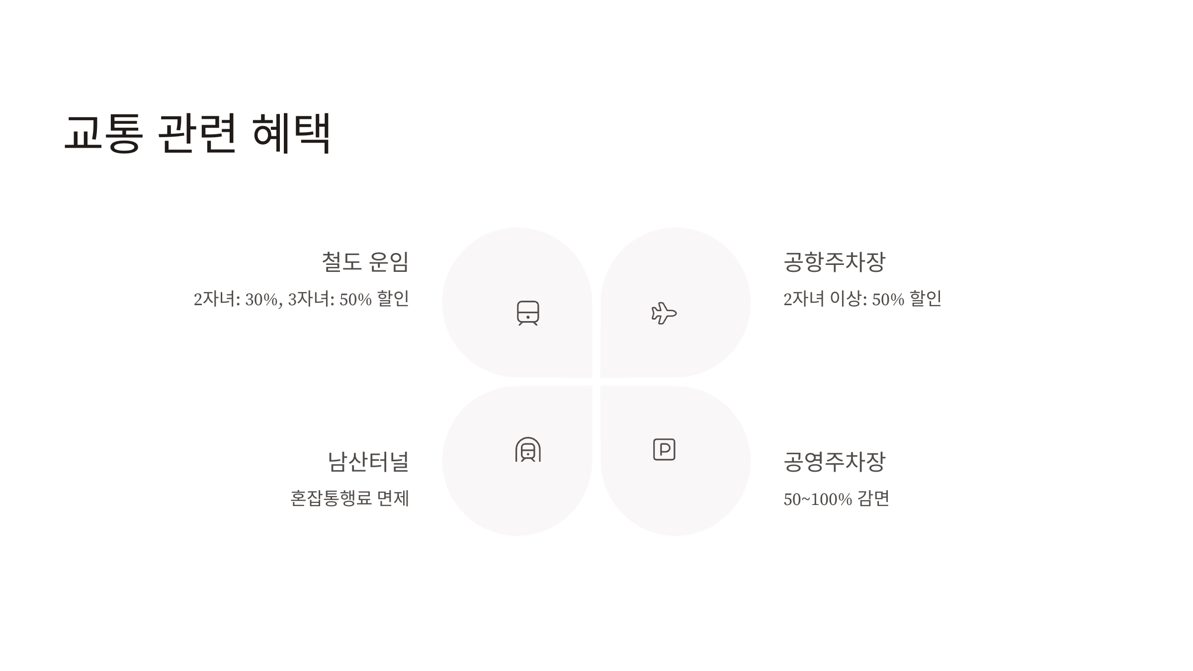 - 2자녀 이상 가구: 공영주차장 주차요금 50%~100% 감면(지역별 상이)