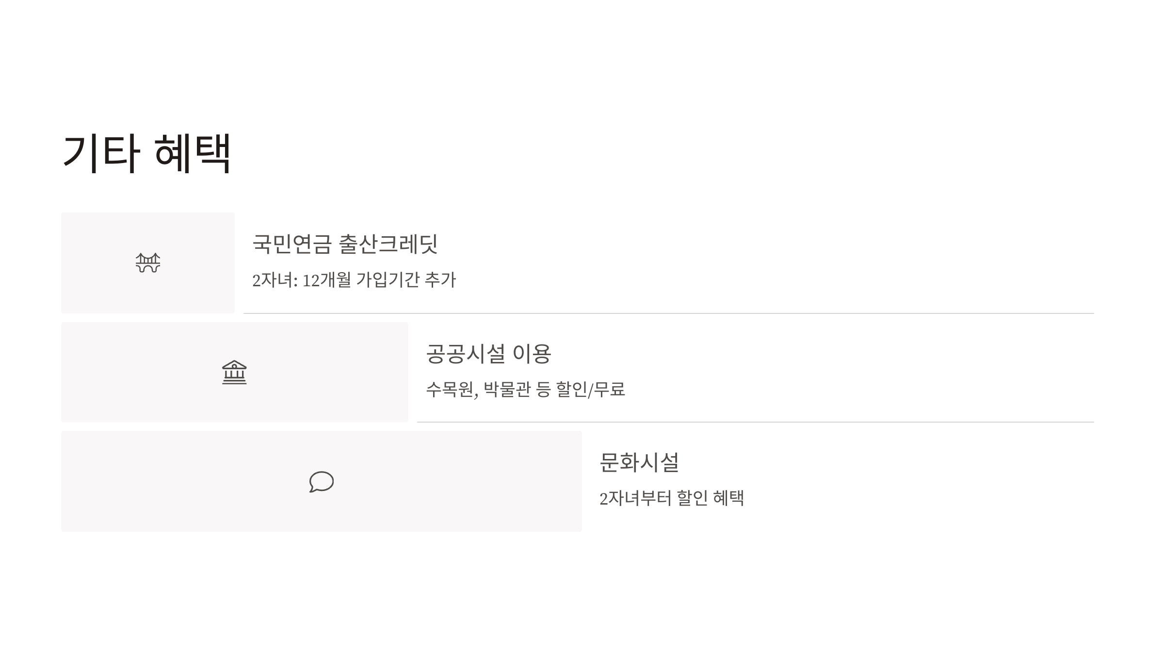 - 국립 문화 시설(극장, 박물관 등): 다자녀 할인 혜택 기준 2자녀로 통일