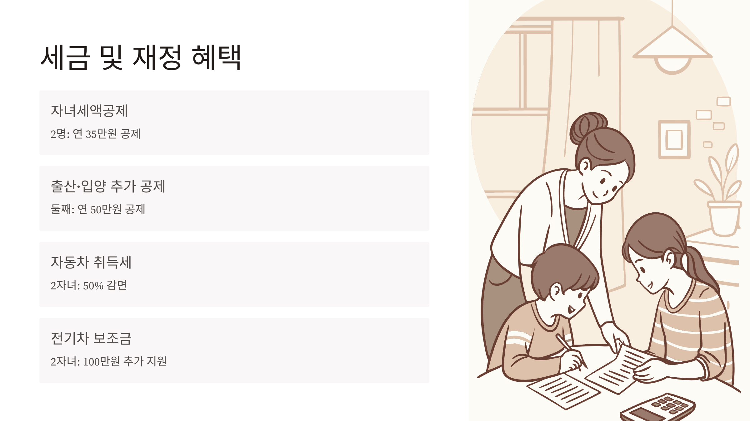 - 2자녀 가구: 취득세 50% 감면