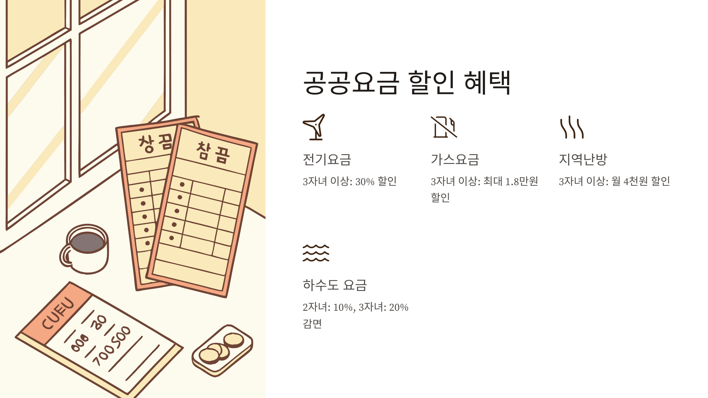 공공요금 할인은 매달 지출되는 고정비용을 줄여주기 때문에 가계 경제에 실질적인 도움이 되어요.
