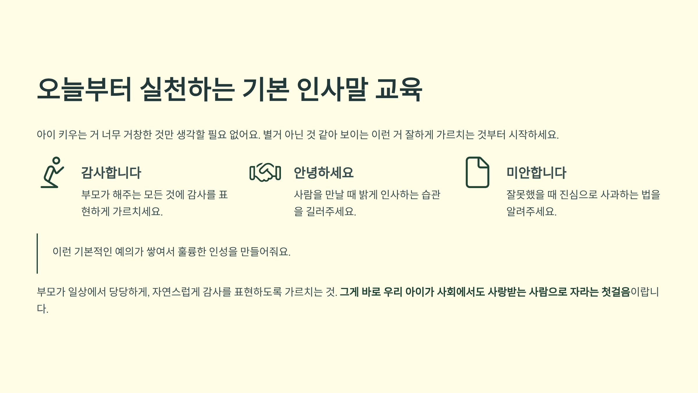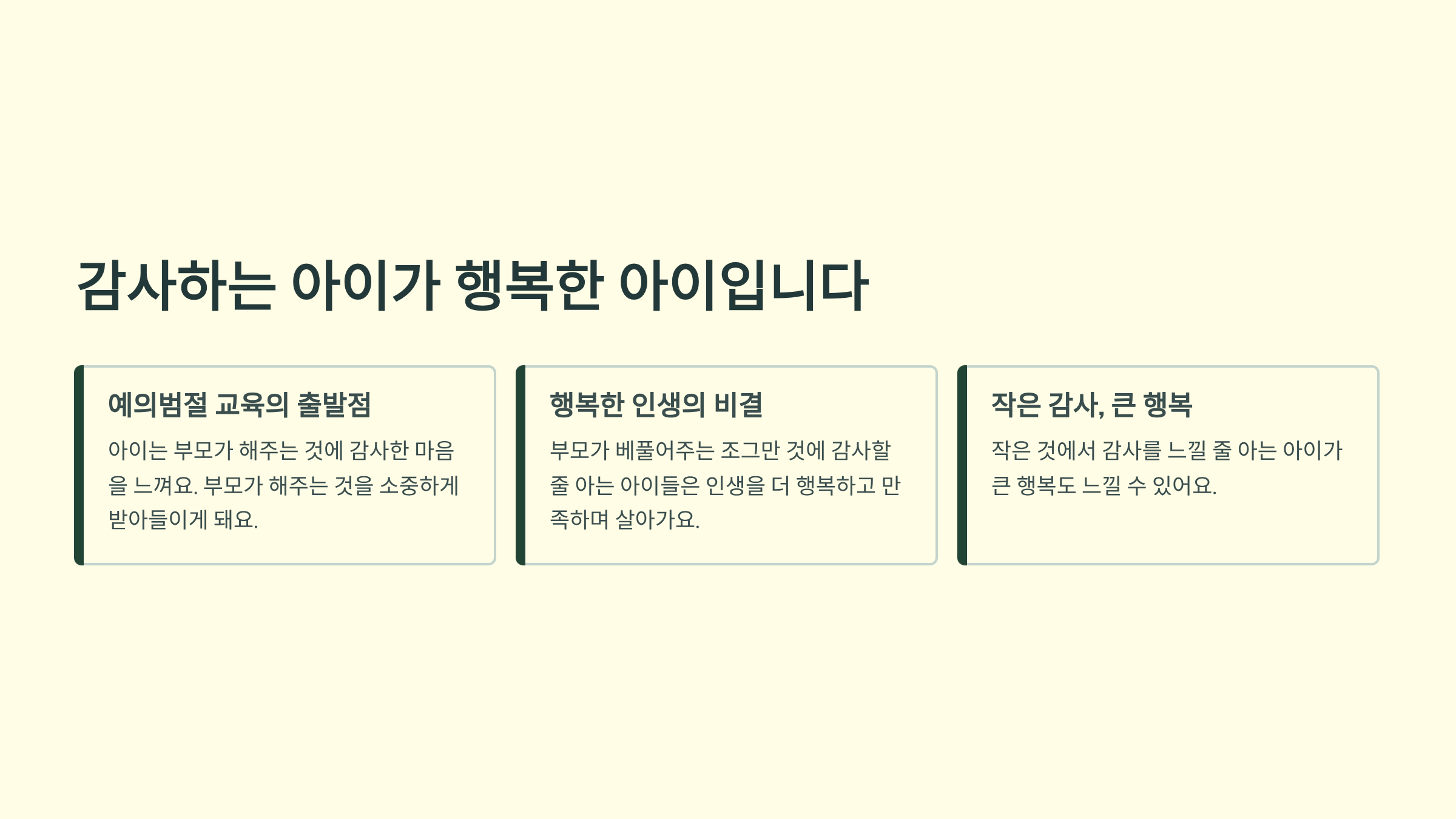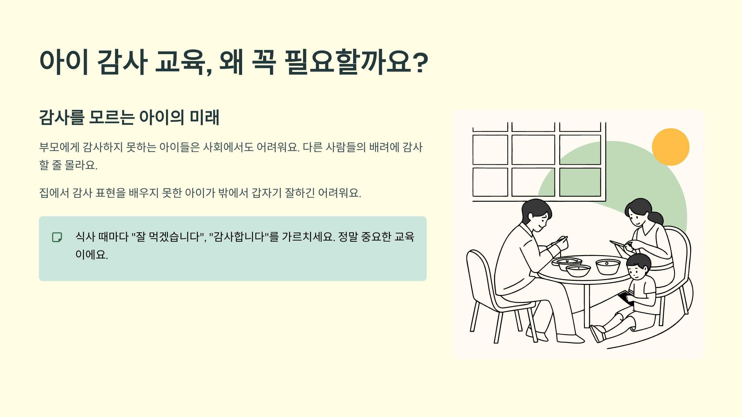 부모가 일상에서 당당하게, 그리고 자연스럽게 감사를 표현하도록 가르치는 것. 그게 바로 우리 아이가 사회에서도 사랑받는 사람으로 자라는 첫걸음이랍니다.