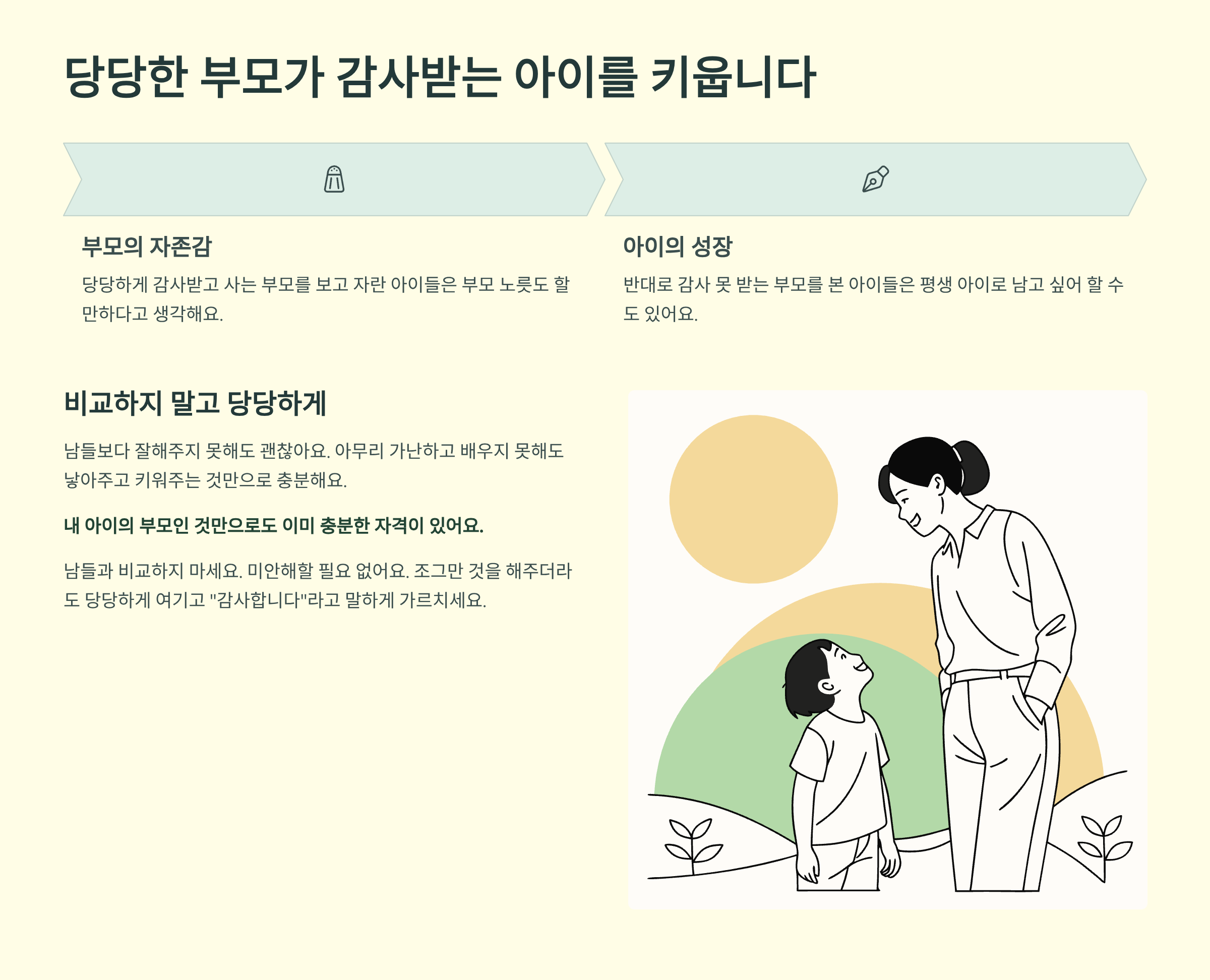 남들과 비교하지 마세요. 내가 남들보다 잘해주지 못한다고 미안해할 필요 없어요. 아무리 조그만 것을 아이에게 해주더라도 내가 해주는 것을 당당하게 여기고, "감사합니다"라고 말하게 가르치세요.