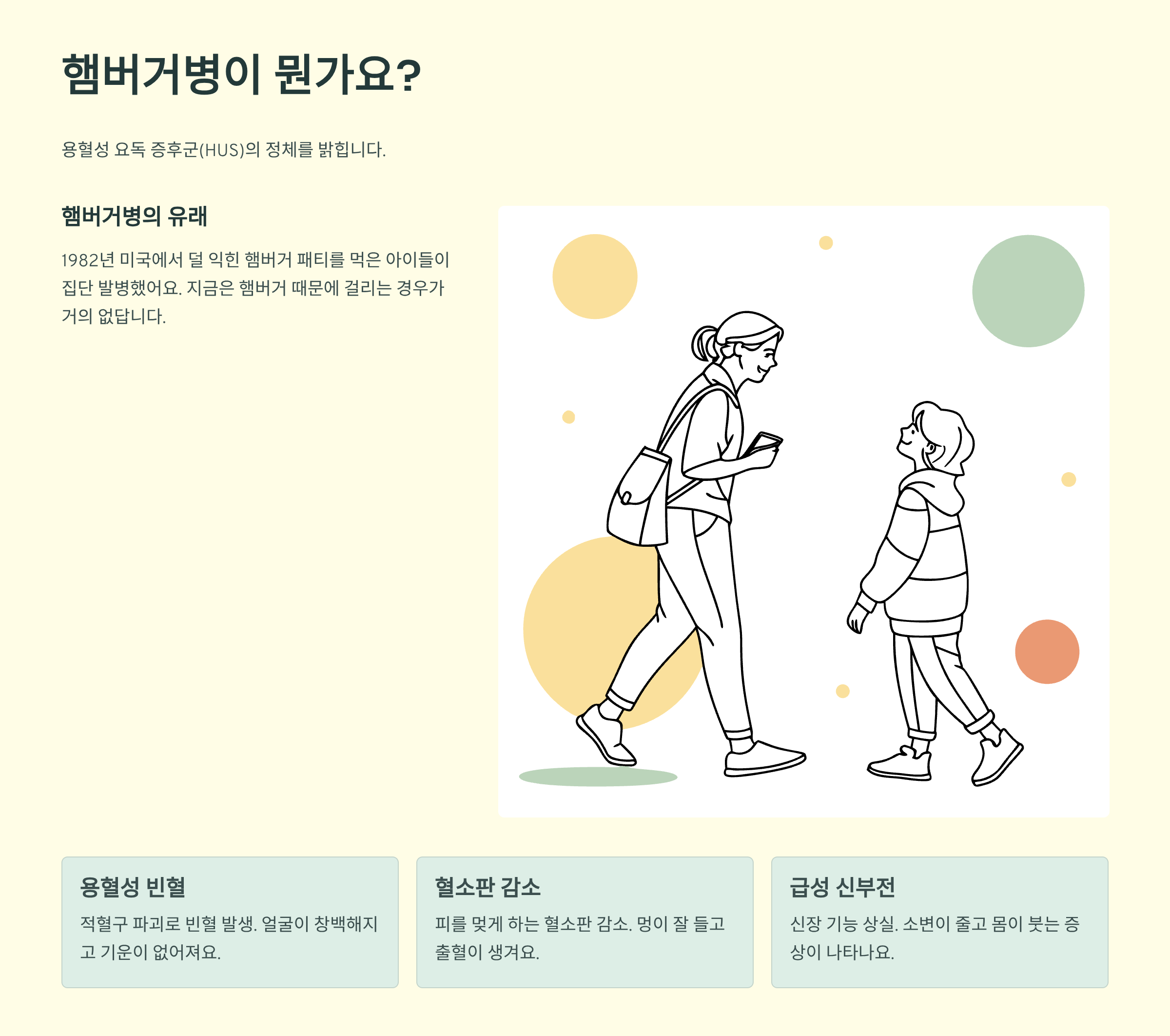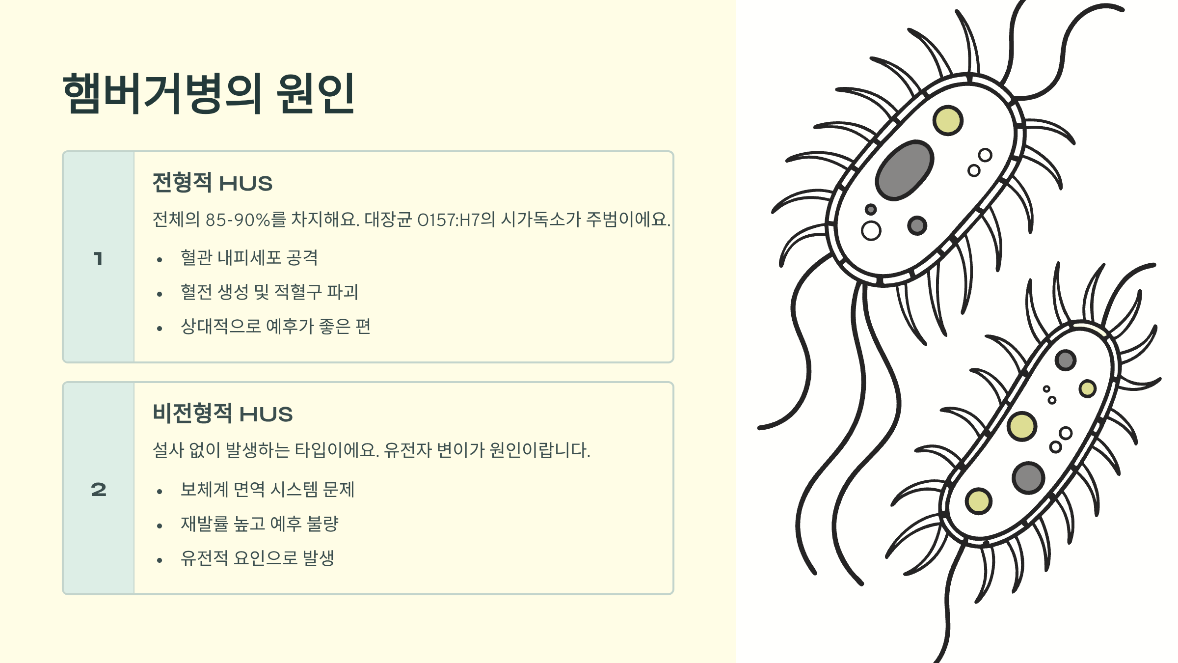 햄버거병, 정확한 의학 용어로는 '용혈성 요독 증후군(HUS, Hemolytic Uremic Syndrome)'이에요. 1982년 미국에서 덜 익힌 햄버거 패티를 먹은 아이들이 집단으로 이 병에 걸리면서 '햄버거병'이라는 별명이 붙었답니다.