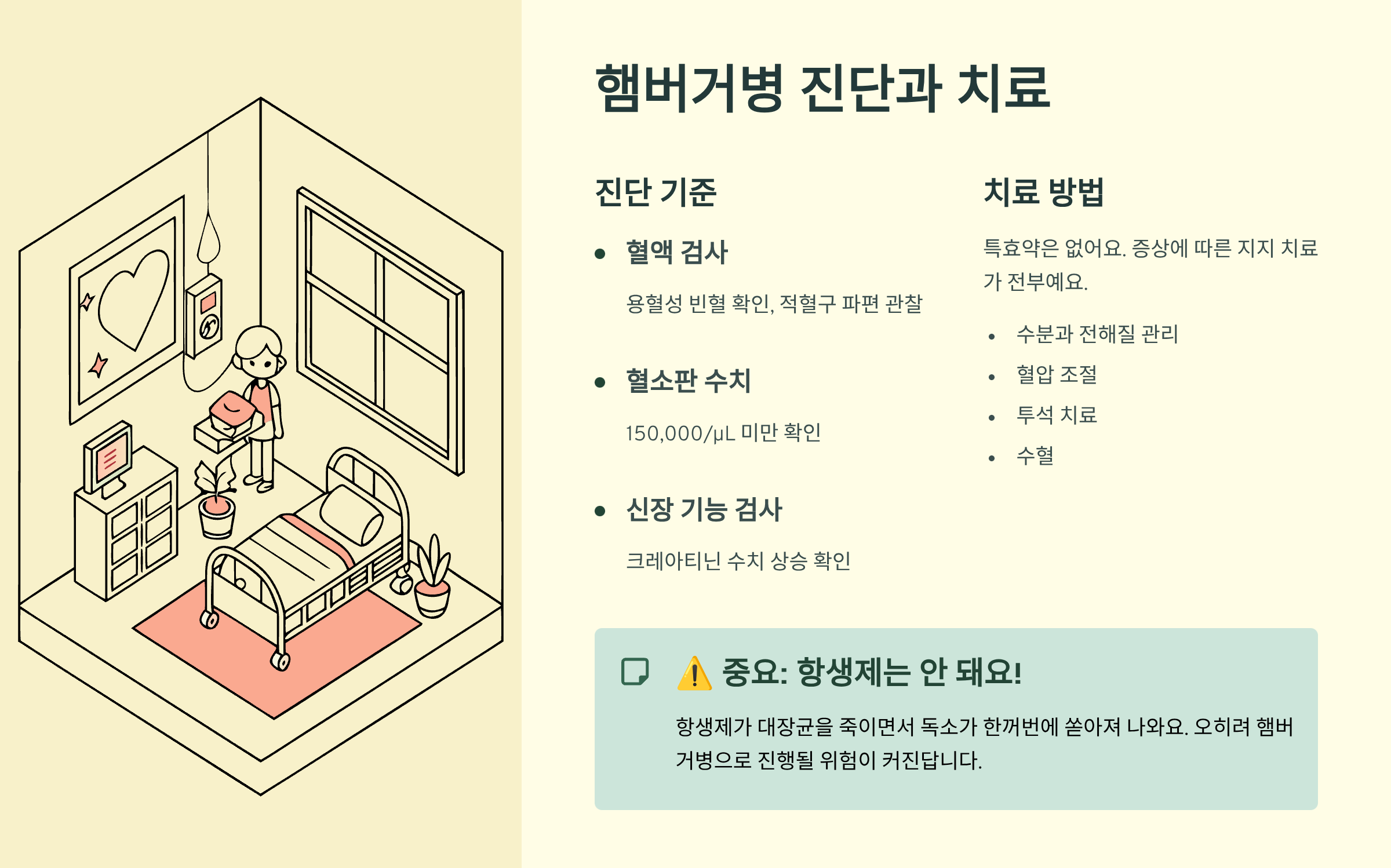 여기 정말 중요한 포인트예요. 식중독 때문에 항생제를 함부로 먹이면 안 돼요! 항생제가 대장균을 죽이면서 독소가 한꺼번에 쏟아져 나와서 오히려 햄버거병으로 진행될 위험이 커져요.