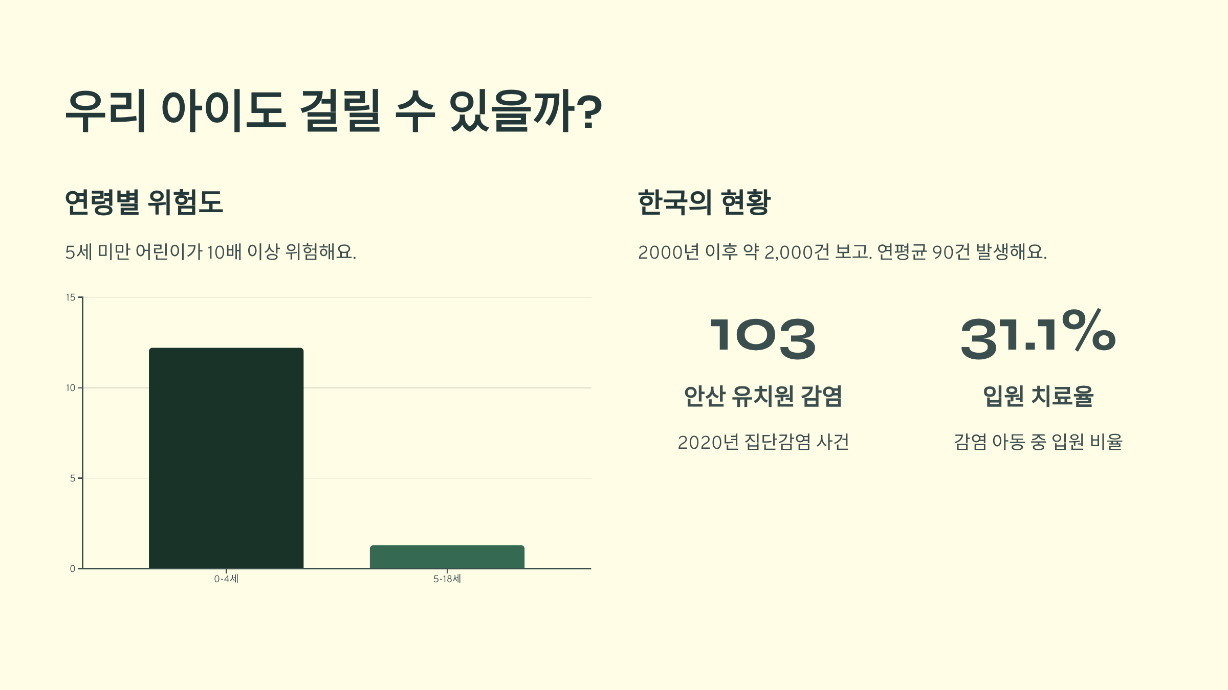 5세 미만 어린이가 다른 연령대보다 10배 이상 위험해요. 0-4세는 연간 백만 명당 12.2명 발생하는 반면, 5-18세는 1.3명에 불과하답니다. 아직 면역체계가 덜 발달한 영유아들이 특히 취약한 거예요.