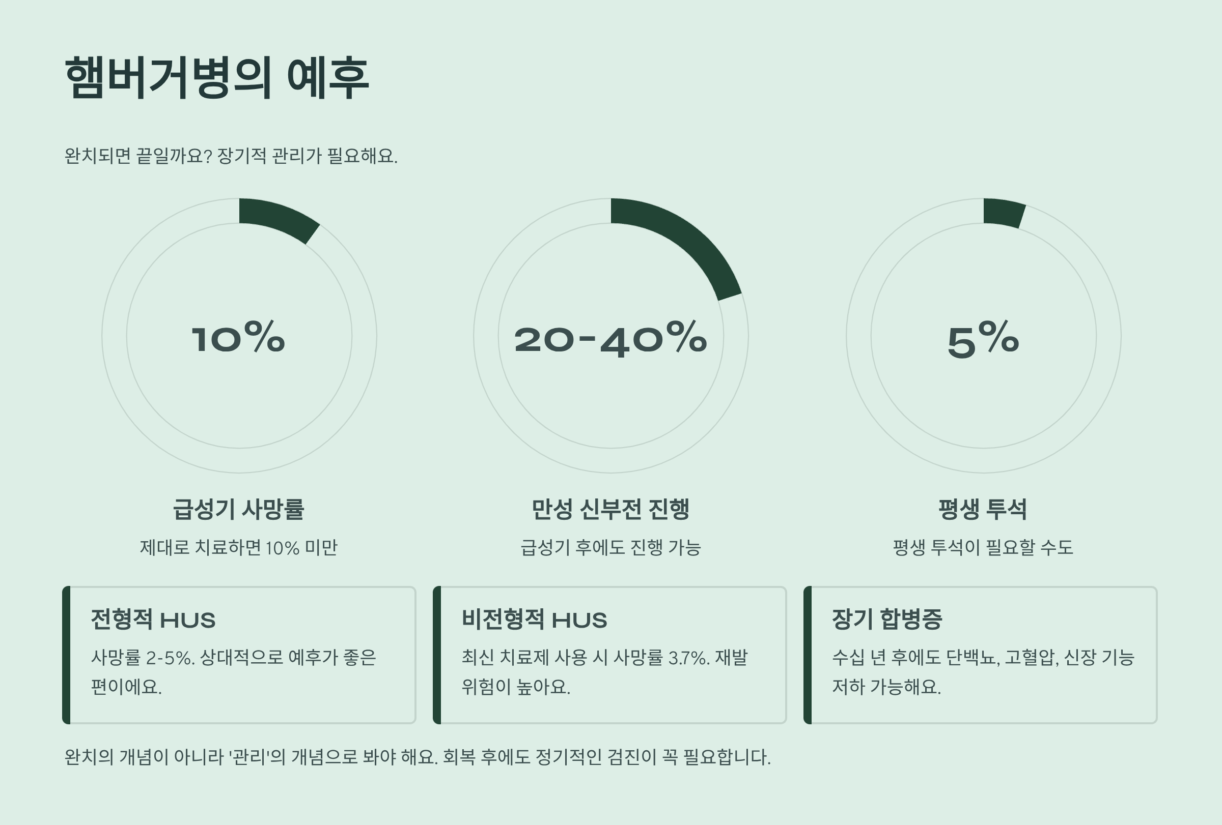제대로 치료하면 급성기 사망률은 10% 미만이에요. 전형적 HUS는 2-5%, 비전형적 HUS는 최신 치료제(에쿨리주맙)를 쓰면 3.7% 정도예요.
