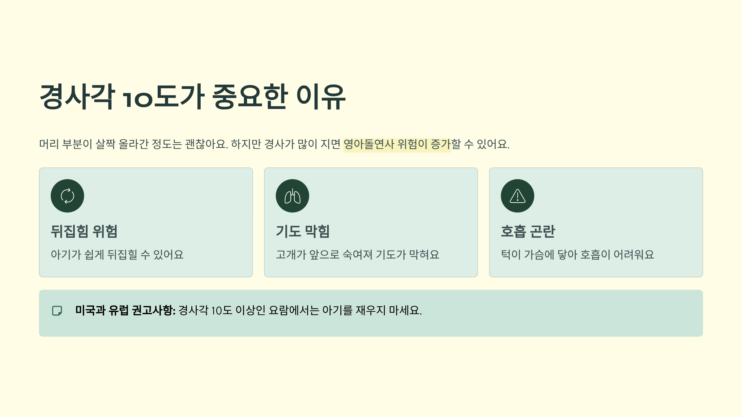 그런데 문제는 바로 경사진 곳에서 아기가 잠을 잔다는 거예요. 우리 어른들도 평평한 침대에서 자는 게 편하잖아요? 아기들도 마찬가지랍니다. 평평한 곳에서 자는 게 가장 안전하고 자연스러운 수면 자세예요.