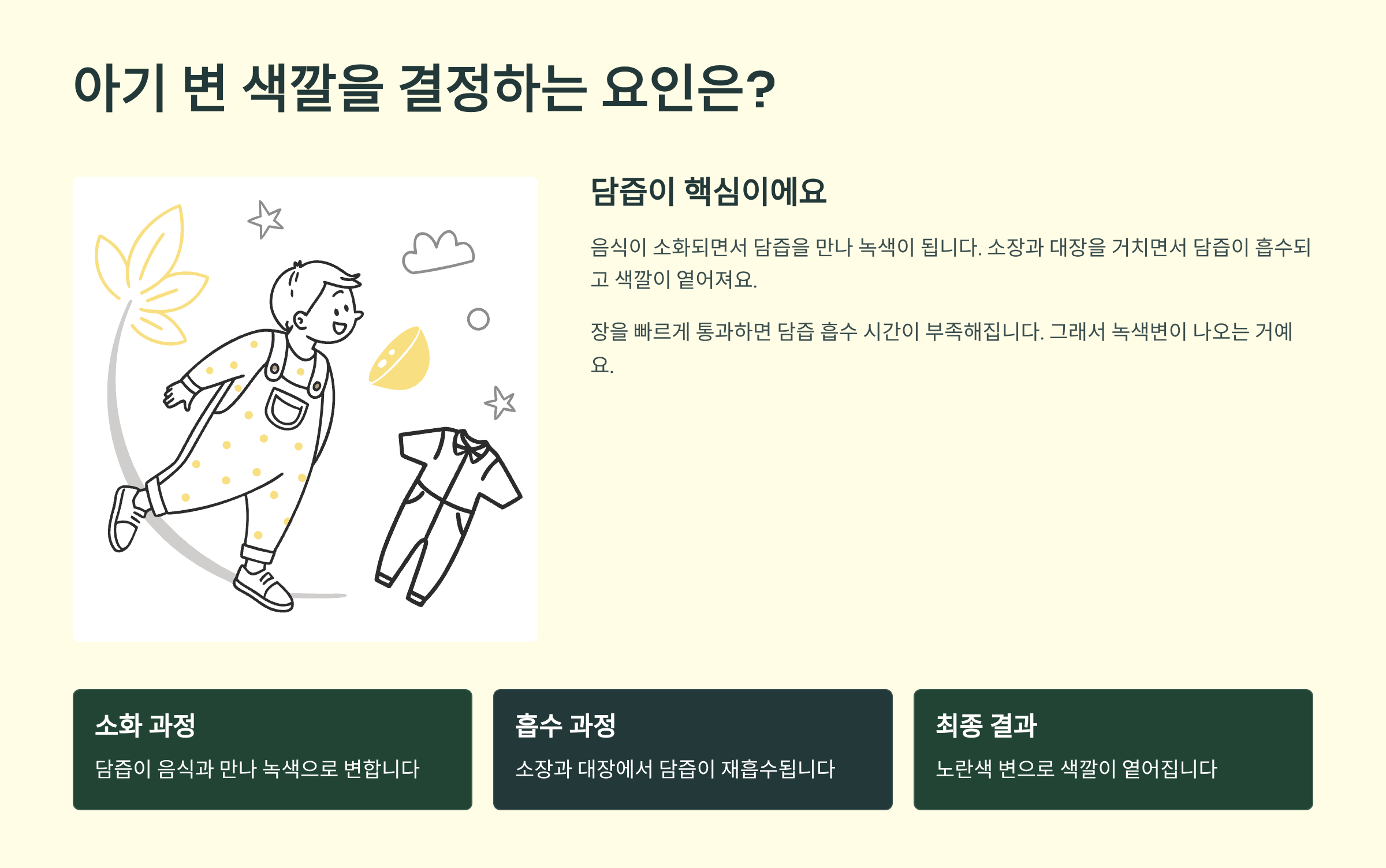 변 색깔을 결정하는 건 바로 담즙이에요. 음식이 소화되는 과정에서 담즙을 만나면 녹색이 되는데, 소장과 대장을 거치면서 대부분의 담즙이 다시 흡수되고 색깔이 옅어지면서 노란색 변이 되는 거죠.