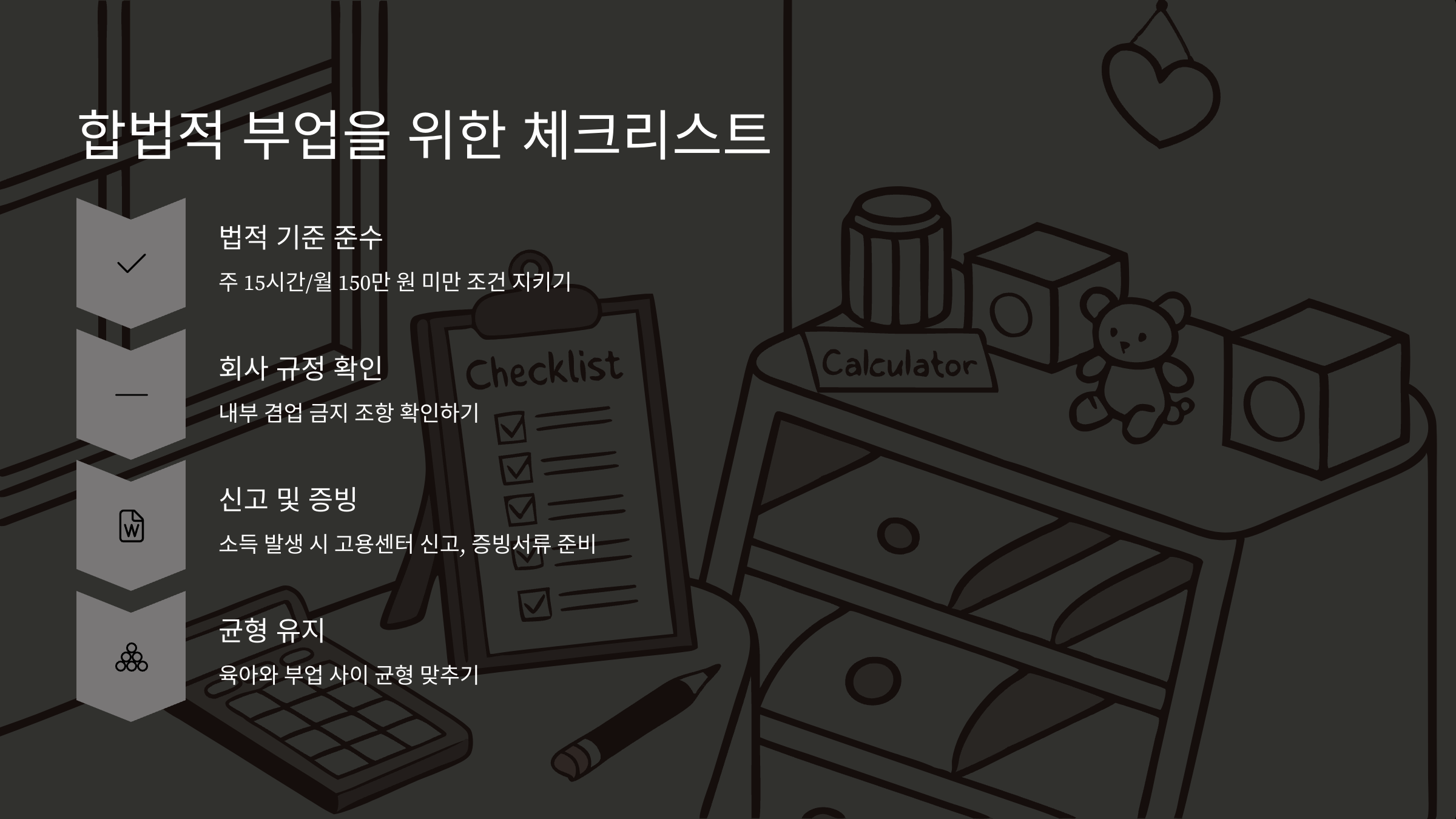 부업 선택 시 장기적인 경력 관리와 육아 우선순위 사이에서 균형을 잘 유지하는 현명한 접근이 필요합니다. 무엇보다 육아휴직의 본래 목적인 자녀 양육에 충실할 수 있는 범위 내에서 부업을 계획하시기 바랍니다!