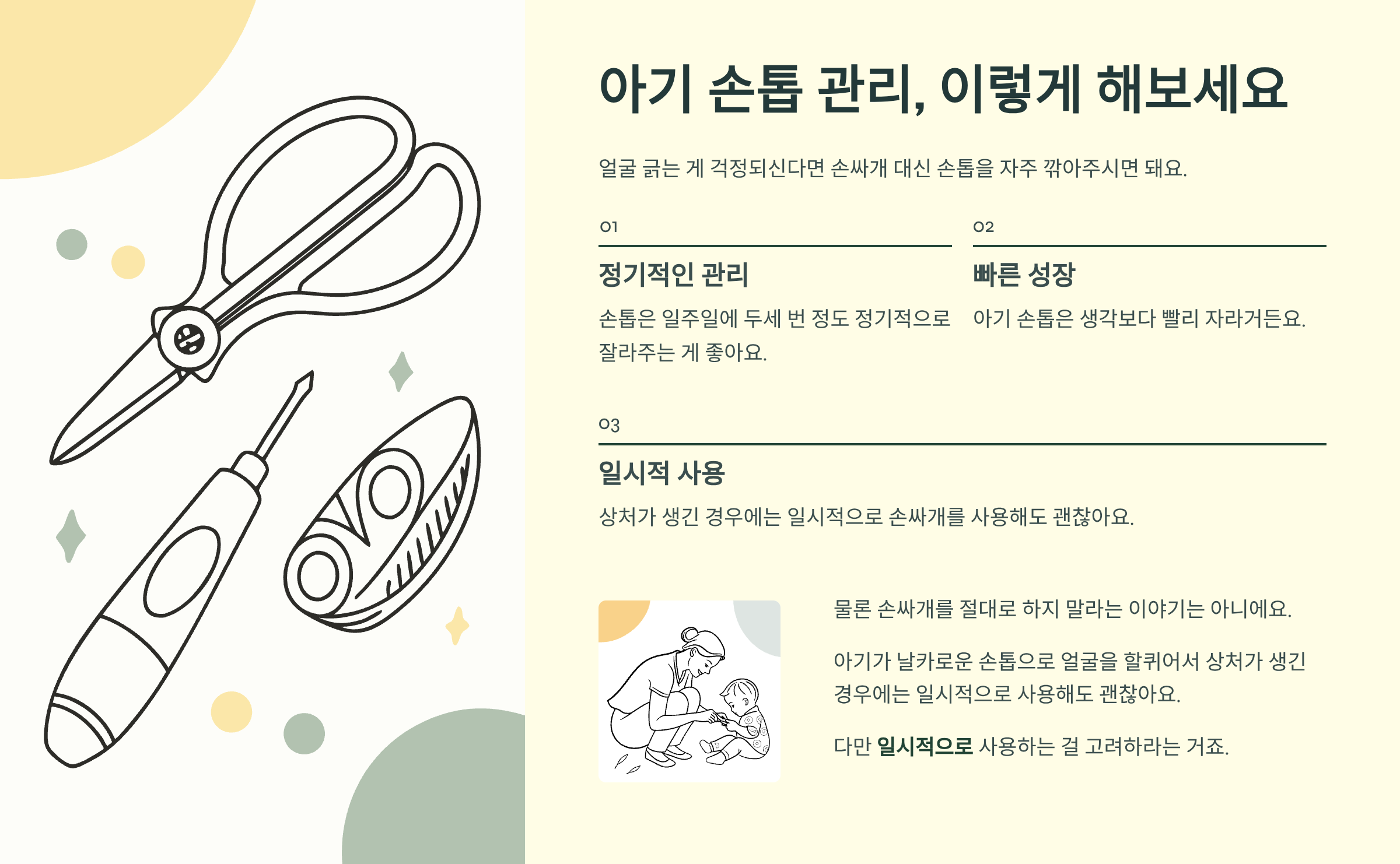 얼굴 긁는 게 걱정되신다면 손싸개 대신 손톱을 자주 깎아주시면 돼요. 손톱은 일주일에 두세 번 정도 정기적으로 잘라주는 게 좋아요. 아기 손톱은 생각보다 빨리 자라거든요.