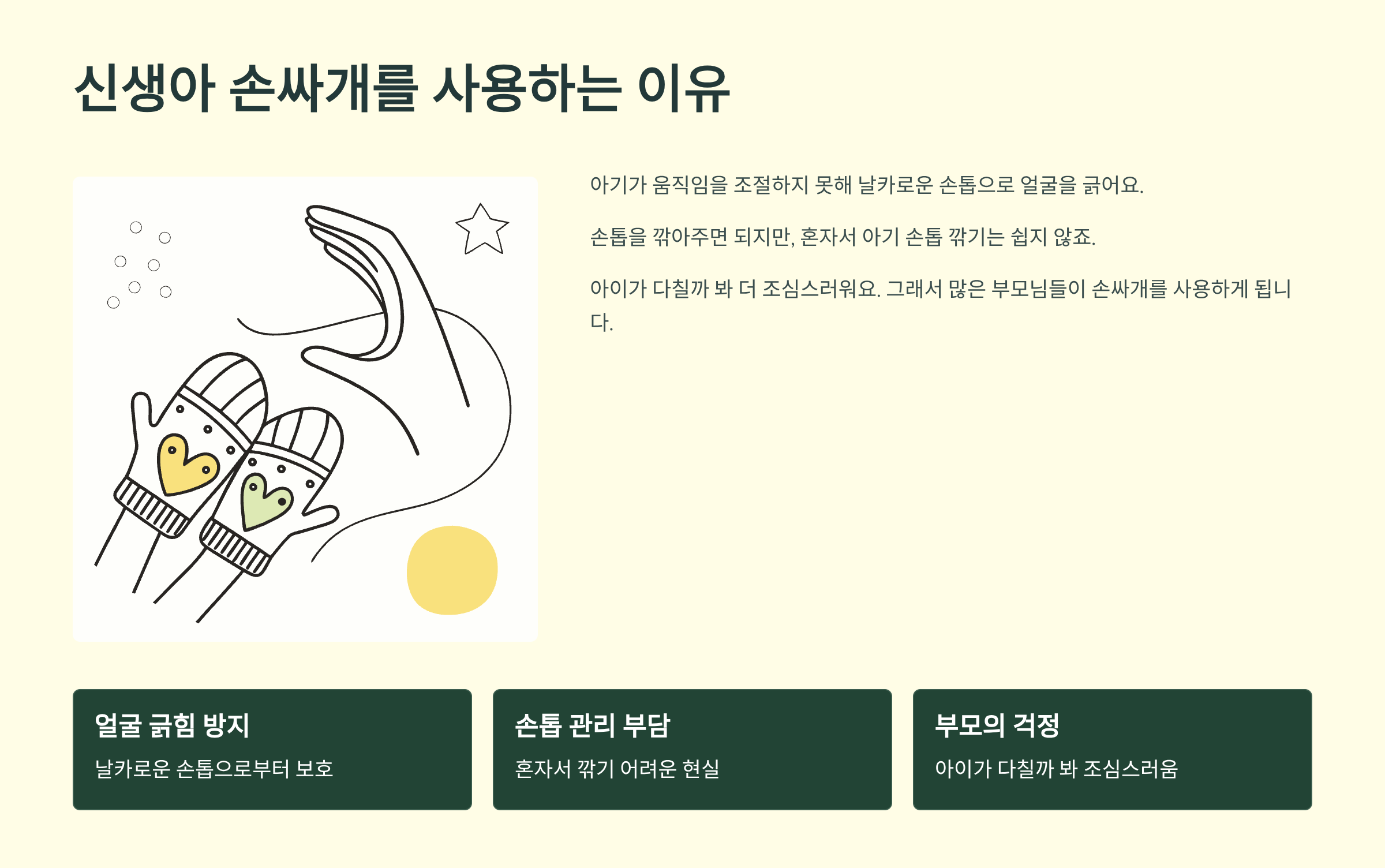 손싸개를 사용하는 이유는 명확하죠. 아기가 아직 자신의 움직임을 조절하지 못해서 날카로운 손톱으로 얼굴을 긁기 때문이에요. 손톱을 깎아주면 되긴 하지만, 엄마 혼자 떨면서 아기 손톱 깎기가 쉽지 않잖아요. 게다가 아이가 다칠까 봐 더 조심스럽고요. 그래서 많은 부모님들이 그냥 손싸개를 사용하게 되는 거예요.