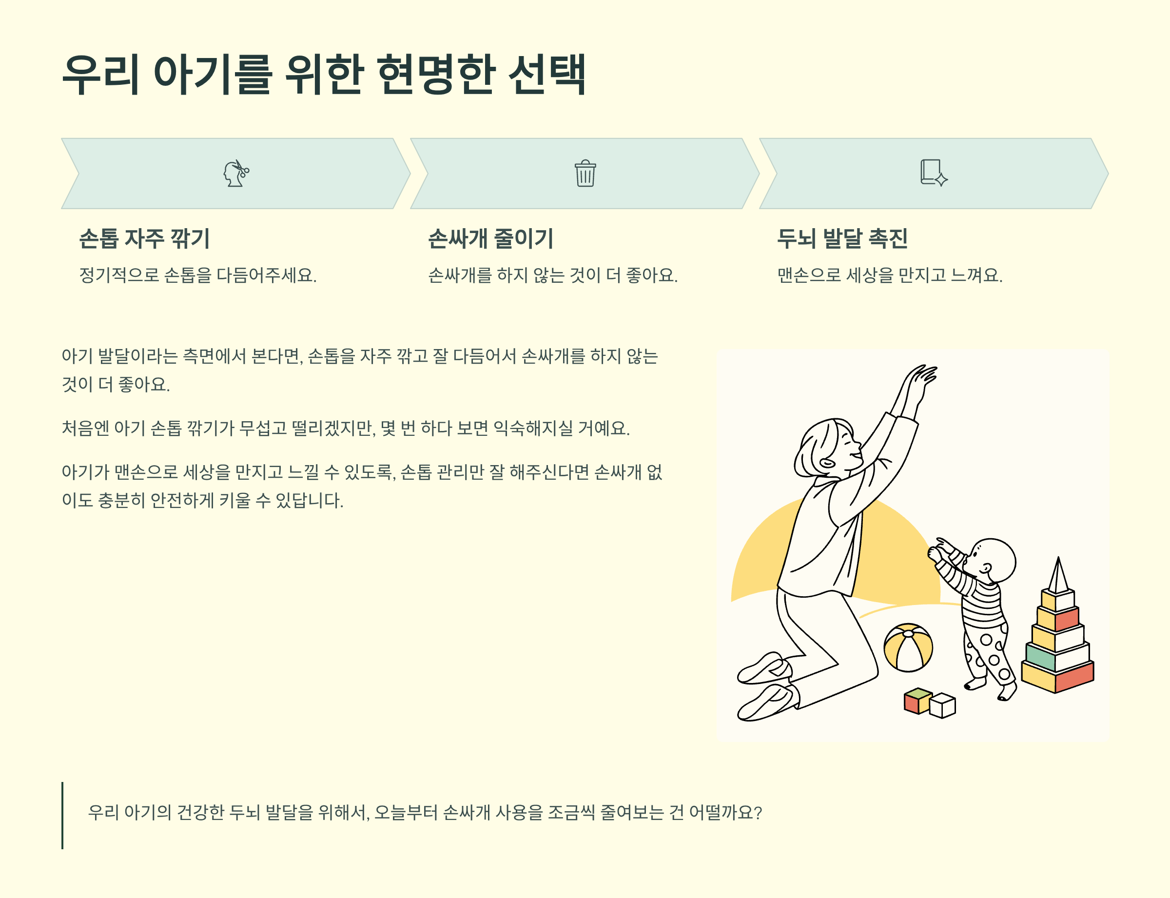 아기가 맨손으로 세상을 만지고 느낄 수 있도록, 손톱 관리만 잘 해주신다면 손싸개 없이도 충분히 안전하게 키울 수 있답니다. 우리 아기의 건강한 두뇌 발달을 위해서, 오늘부터 손싸개 사용을 조금씩 줄여보는 건 어떨까요?