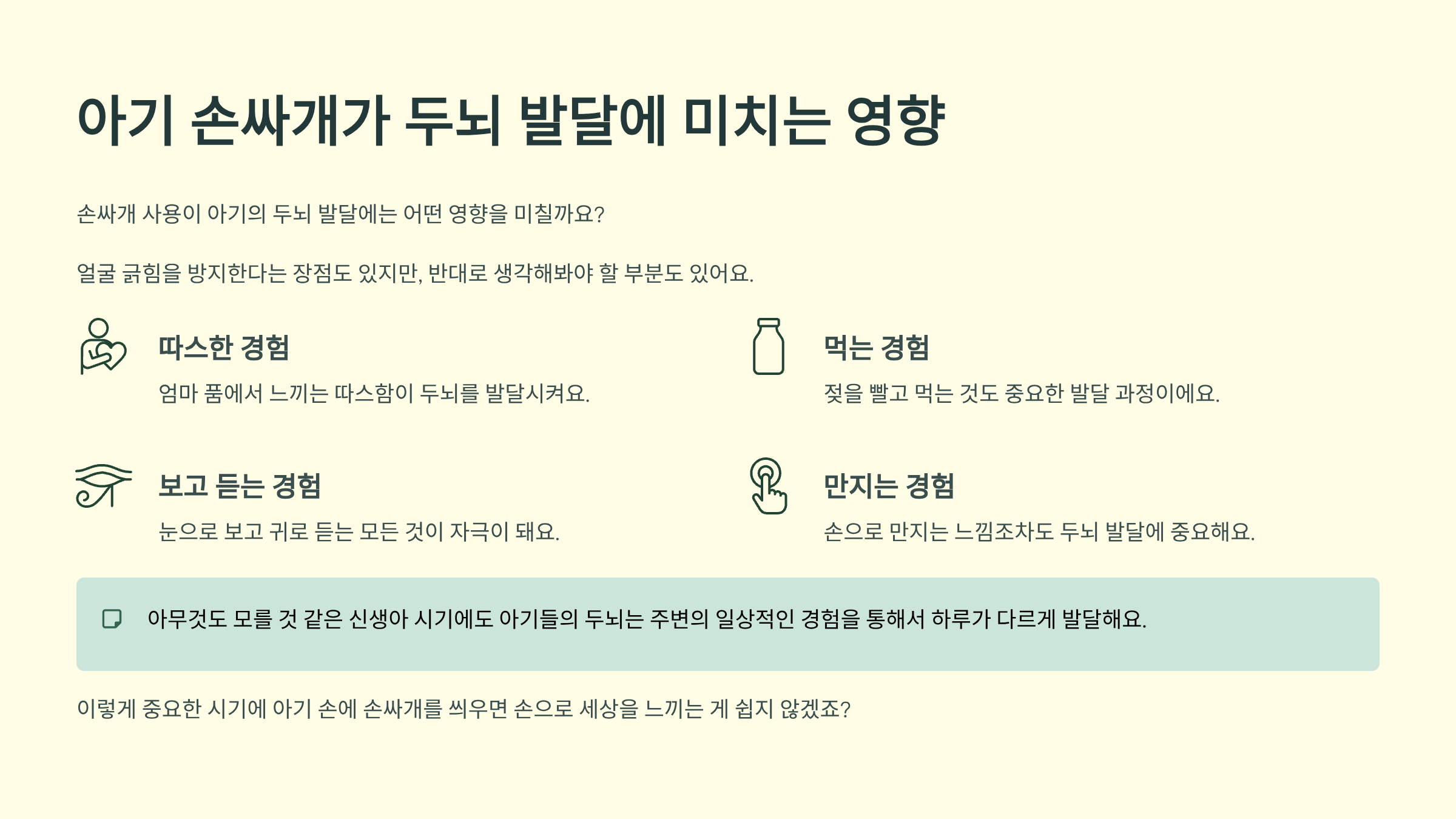 그런데 여기서 잠깐! 손싸개 사용이 아기의 두뇌 발달에는 어떤 영향을 미칠까요? 얼굴 긁힘을 방지한다는 장점도 있지만, 반대로 생각해봐야 할 부분도 있어요.