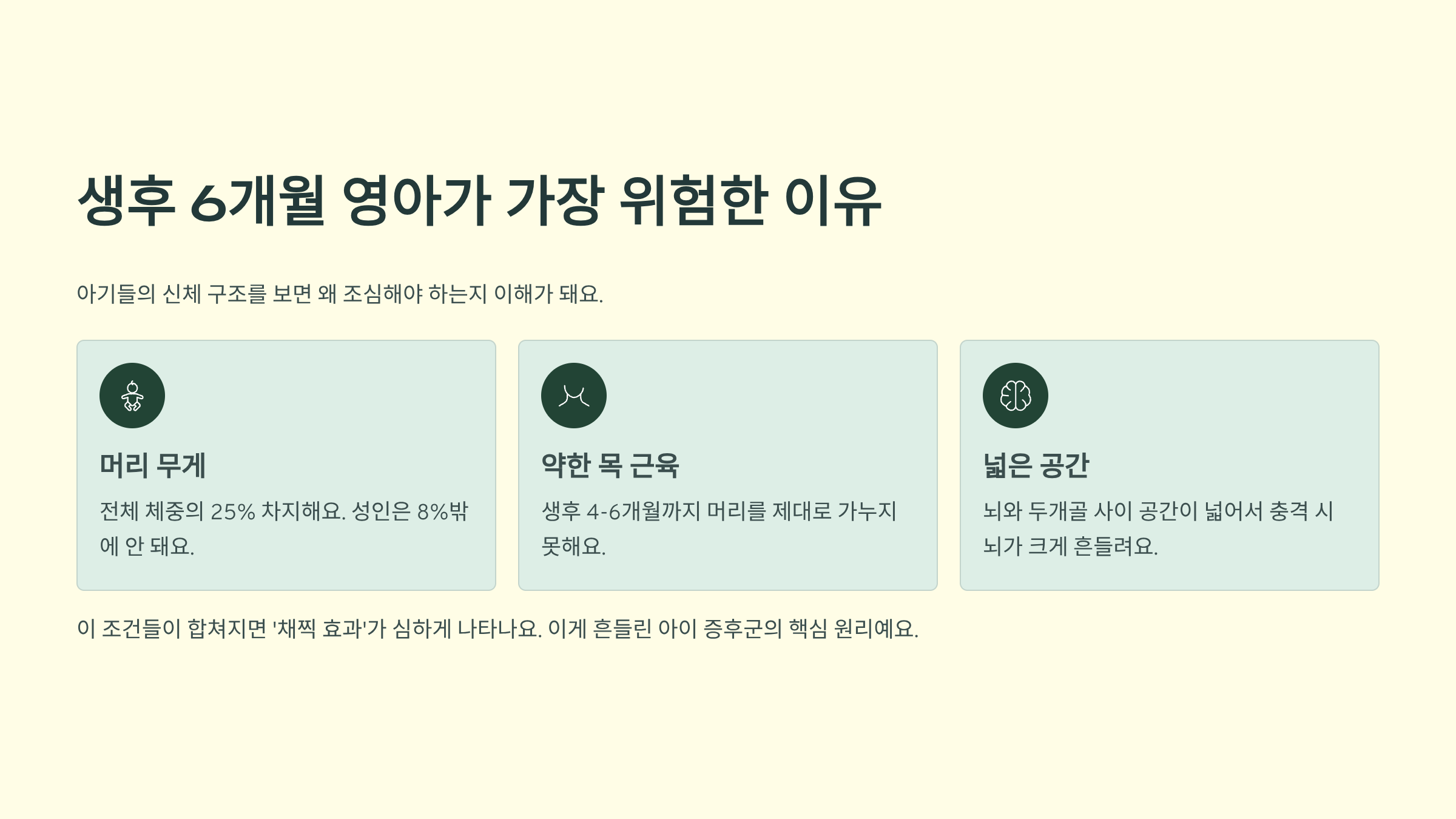 이 조건들이 합쳐지면, 몸은 한쪽으로 움직이는데 머리는 반대로 움직이는 '채찍 효과'가 심하게 나타나요. 이게 바로 흔들린 아이 증후군의 핵심 원리예요.