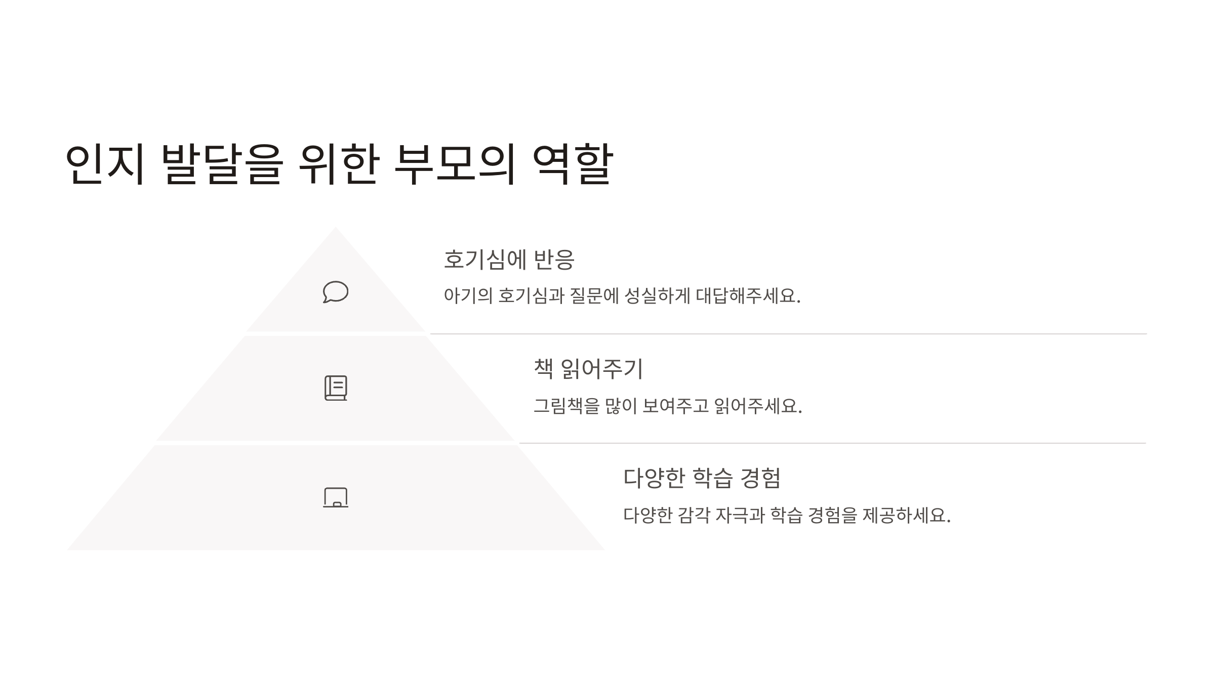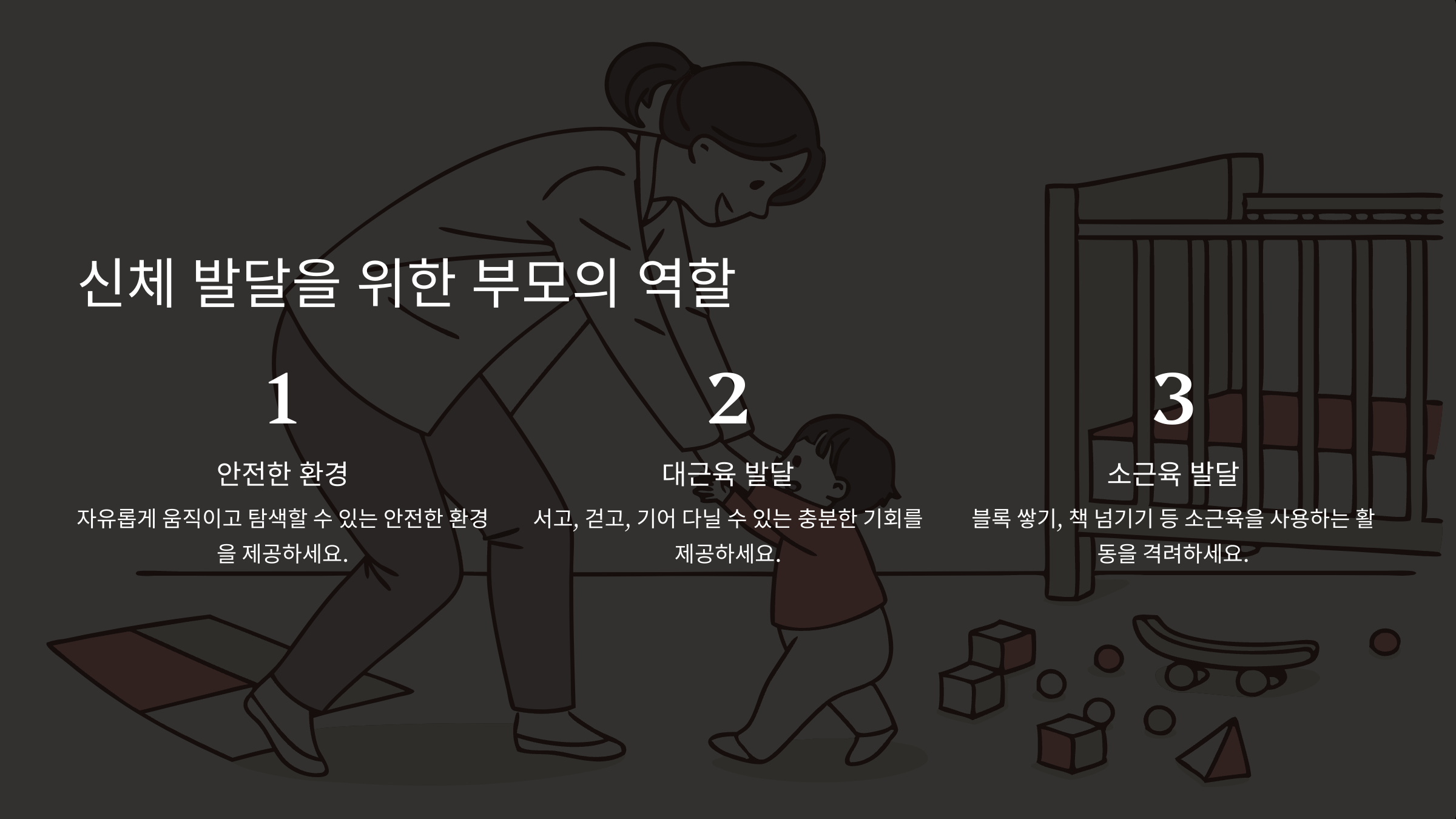아기의 발달을 돕기 위해 부모님이 할 수 있는 역할은 정말 많아요. 영역별로 중요한 역할을 알아볼까요?