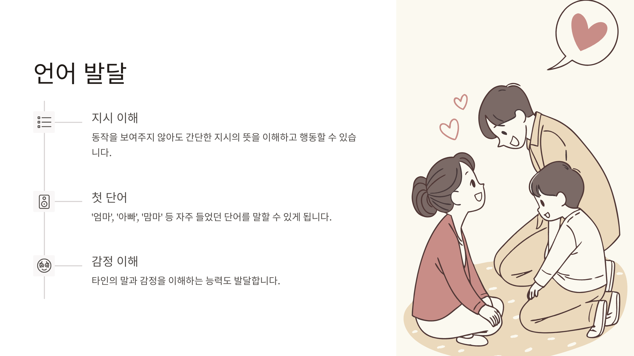 - '엄마', '아빠' 등 첫 단어 말하기