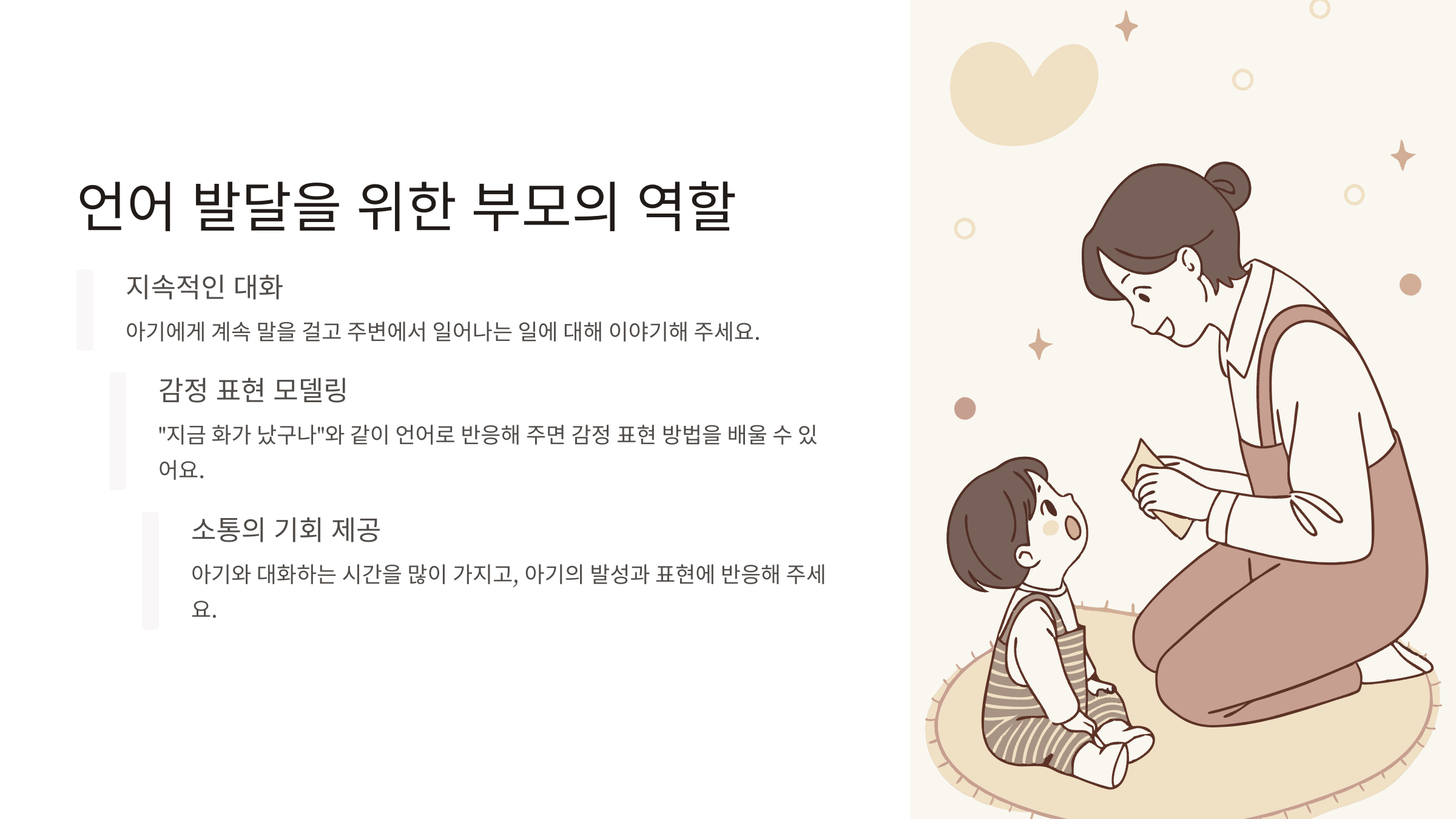 - 언어 발달을 위한 지속적인 대화