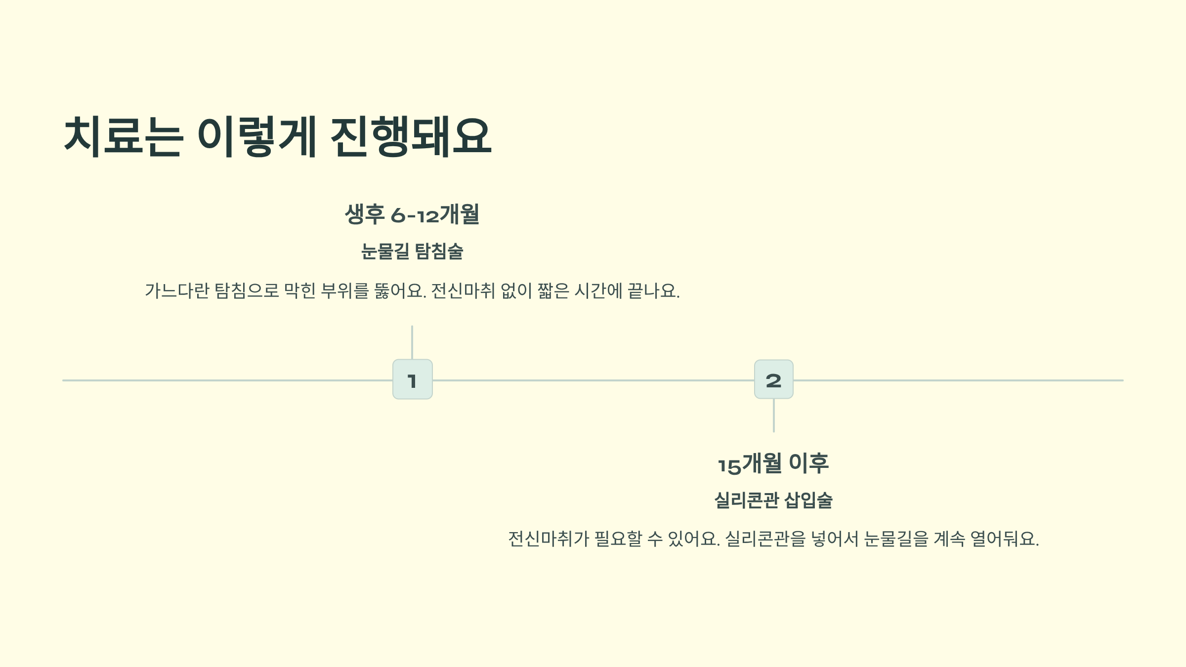 마사지로도 좋아지지 않으면 생후 6-12개월 사이에 간단한 시술을 받을 수 있어요. 가느다란 탐침을 이용해서 막힌 부위를 뚫어주는 건데요. 전신마취 없이 짧은 시간에 끝나고 성공률도 높은 편이에요.