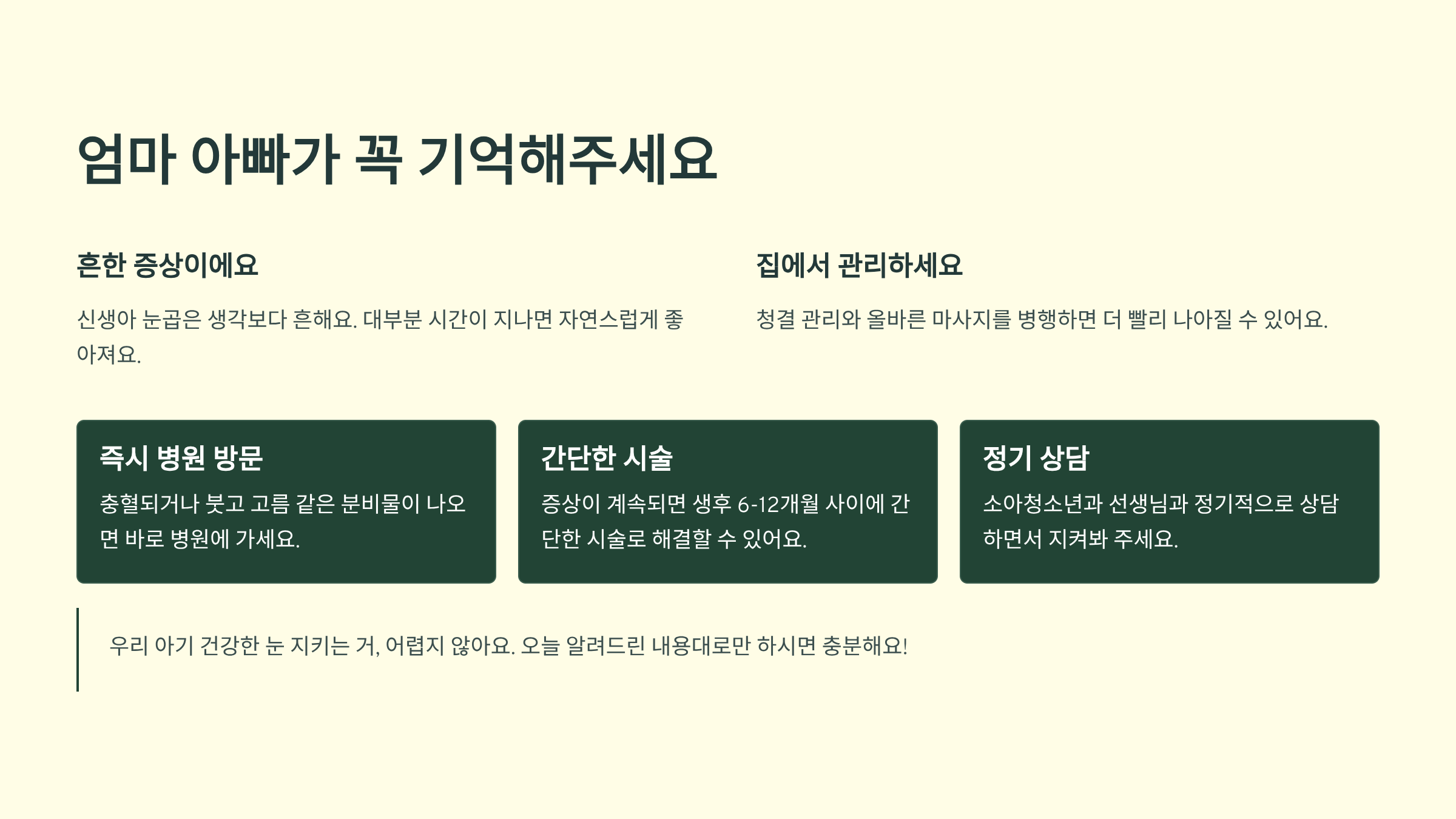 우리 아기 건강한 눈 지키는 거, 어렵지 않아요. 오늘 알려드린 내용대로만 하시면 충분해요!