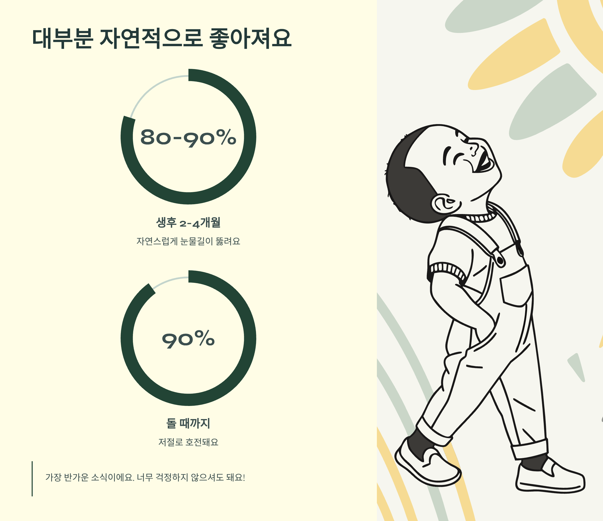 가장 반가운 소식부터 말씀드릴게요. 눈물길이 막힌 아기들 중 무려 80-90%는 생후 2-4개월 안에 자연스럽게 눈물길이 뚫린답니다. 돌 때까지는 90%의 아기가 저절로 호전되니까, 너무 걱정하지 않으셔도 돼요.
