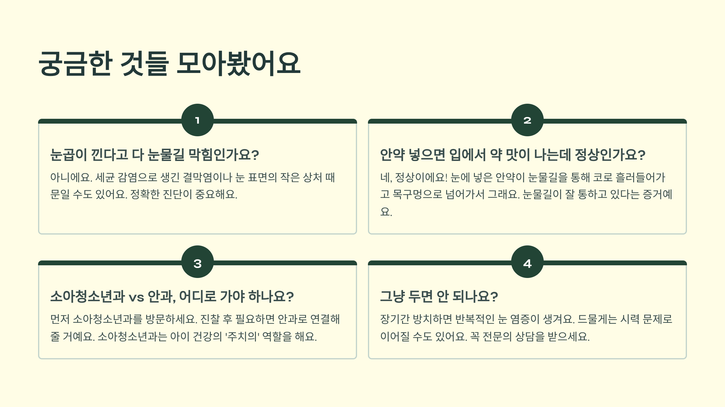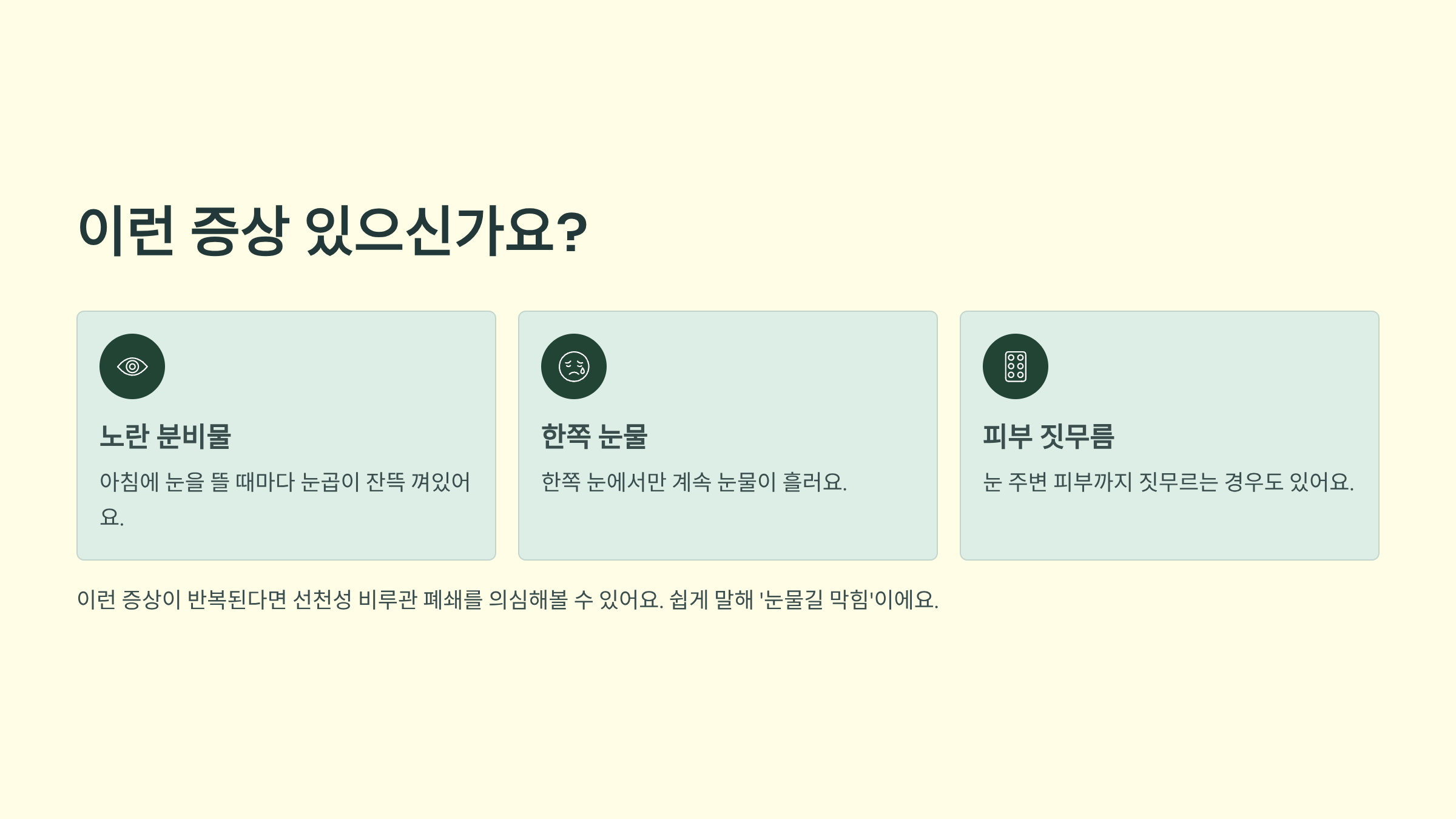 이런 증상들은 단순한 눈물길 막힘이 아니라 결막염이나 눈물주머니염 같은 합병증일 수 있거든요. 정확한 진단을 받는 게 중요해요.