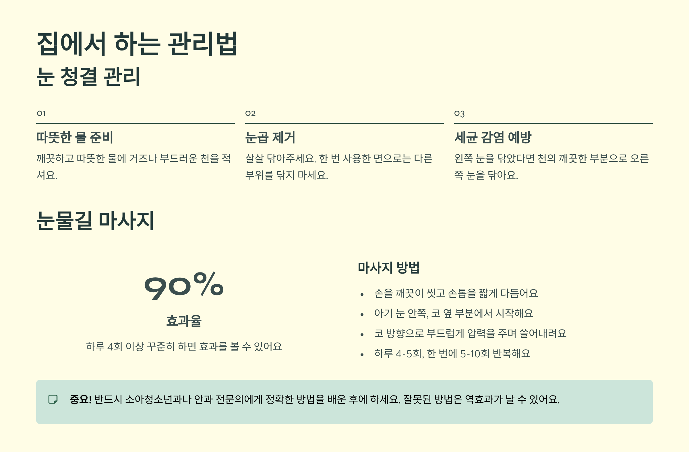 여기서 꼭 기억할 점! 한 번 사용한 면으로는 절대 다른 부위를 닦지 마세요. 왼쪽 눈을 닦았다면 천의 깨끗한 부분으로 오른쪽 눈을 닦아야 해요. 혹시 모를 세균 감염을 막기 위해서랍니다.
