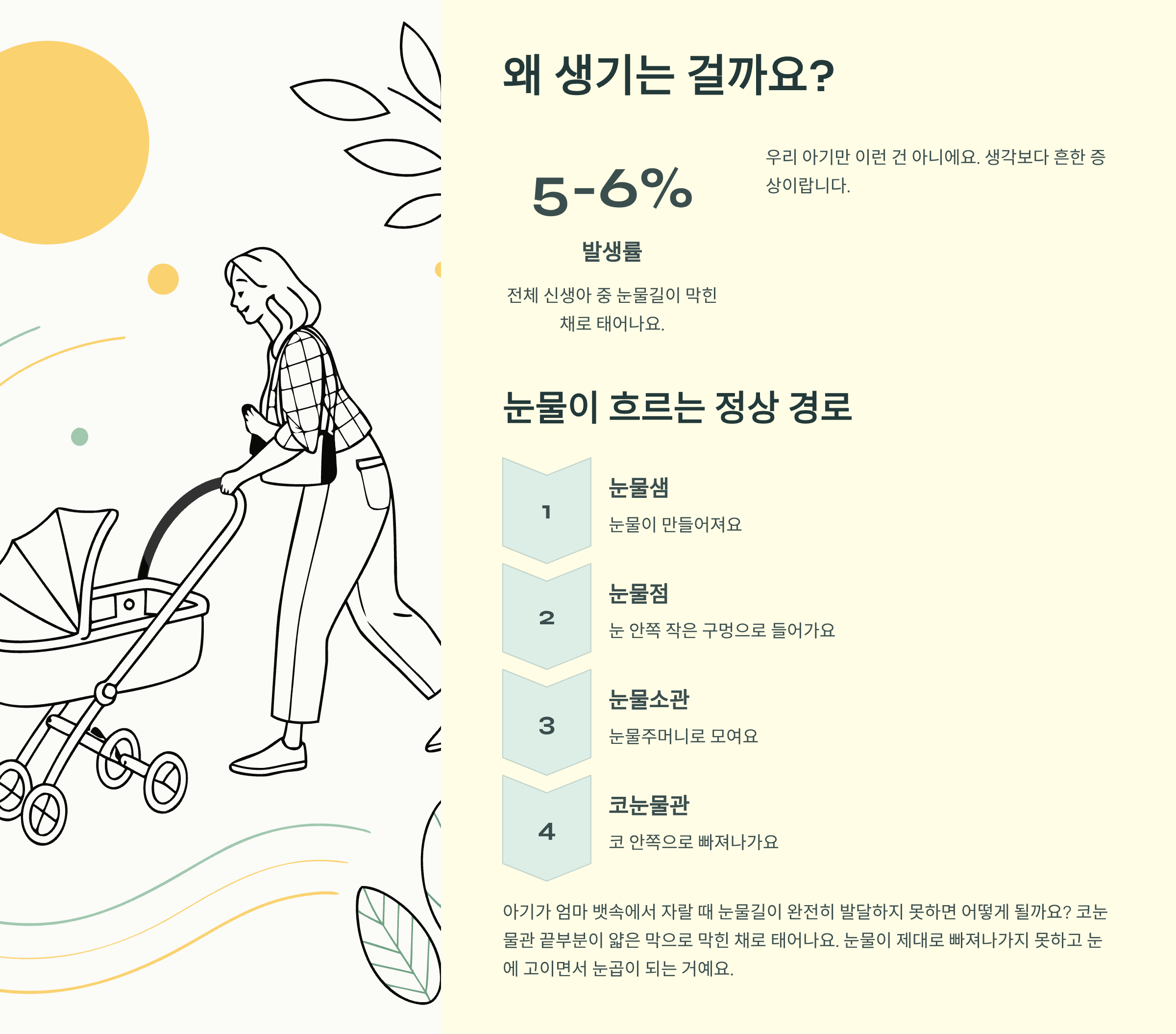 우리 아기만 이런 건 아닐까 걱정하셨다면, 안심하세요. 전체 신생아의 약 5-6%가 태어날 때부터 눈물길이 막힌 상태로 태어난답니다.