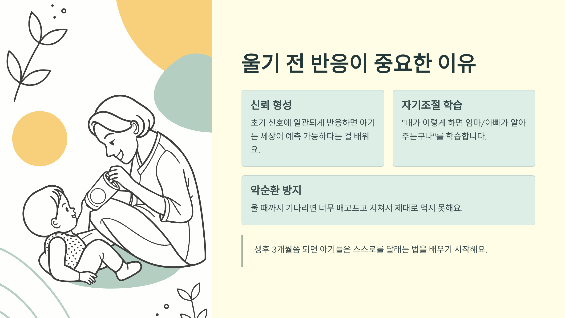 초기 신호에 일관되게 반응해주면 아기는 "아, 내가 이렇게 하면 엄마/아빠가 알아주는구나"를 학습해요. 이게 바로 자기조절 능력의 첫걸음이에요.