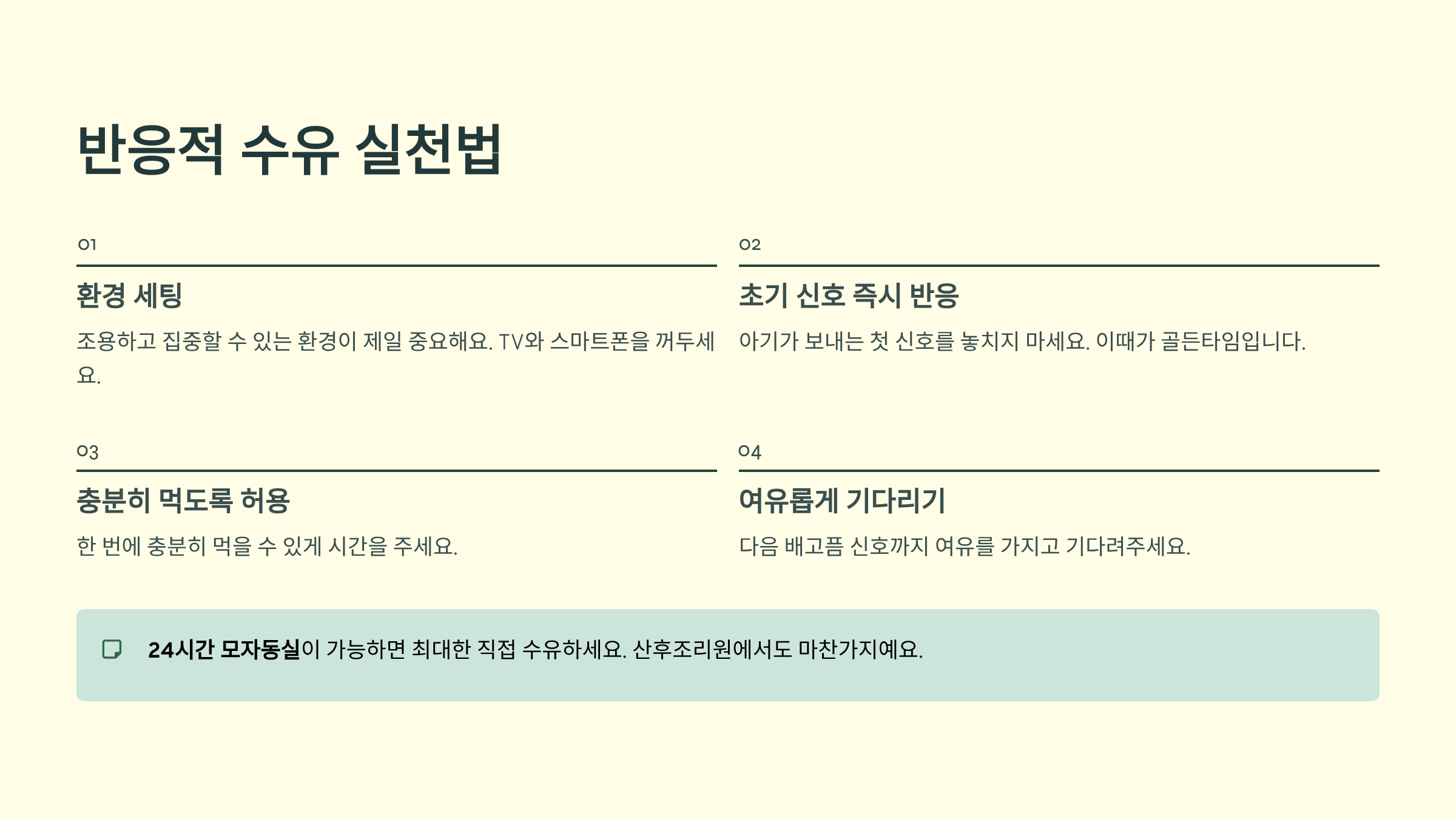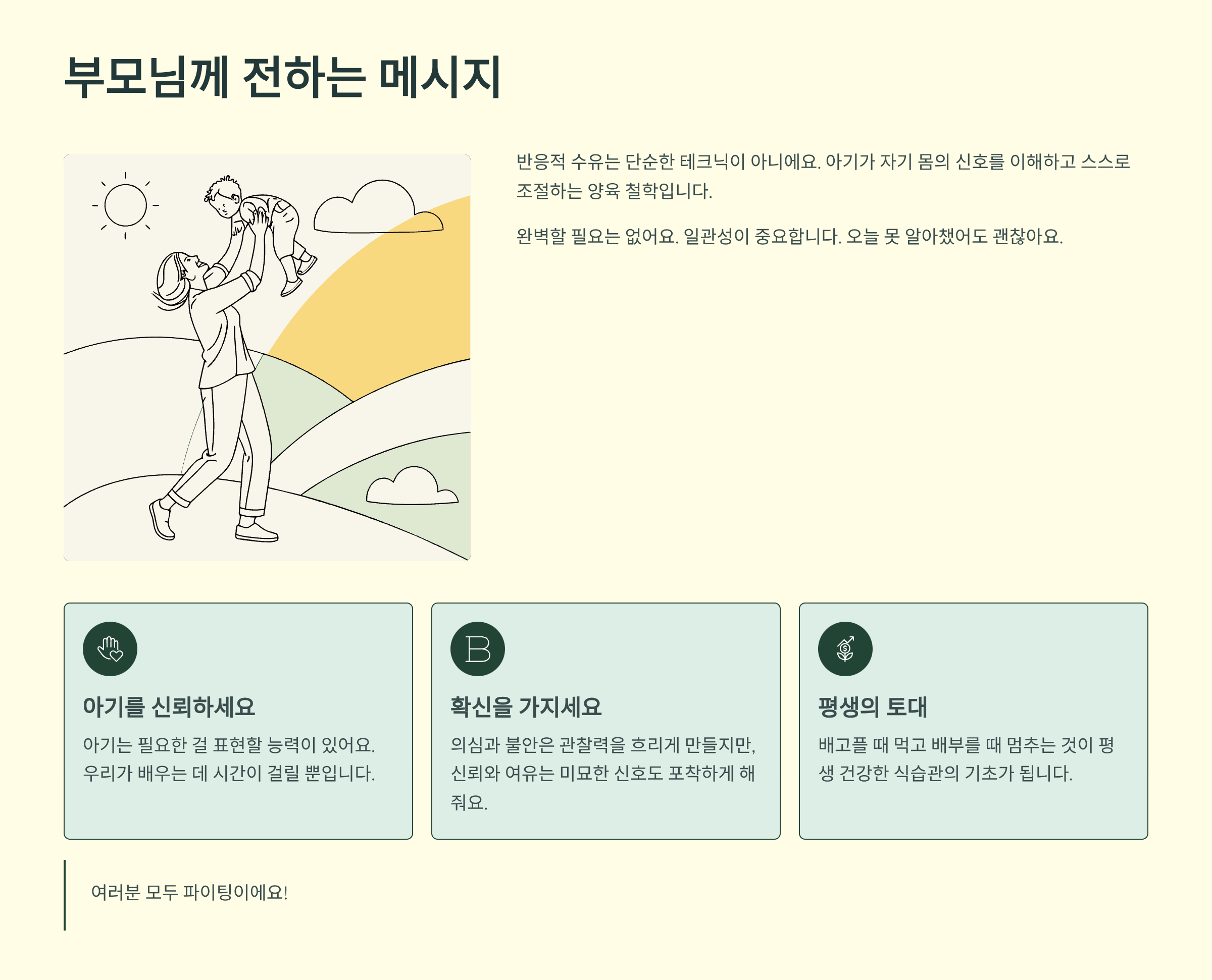 반응적 수유는 단순한 수유 테크닉이 아니에요. 아기가 자기 몸의 신호를 이해하고, 스스로 조절하는 법을 배우도록 돕는 양육 철학이에요.