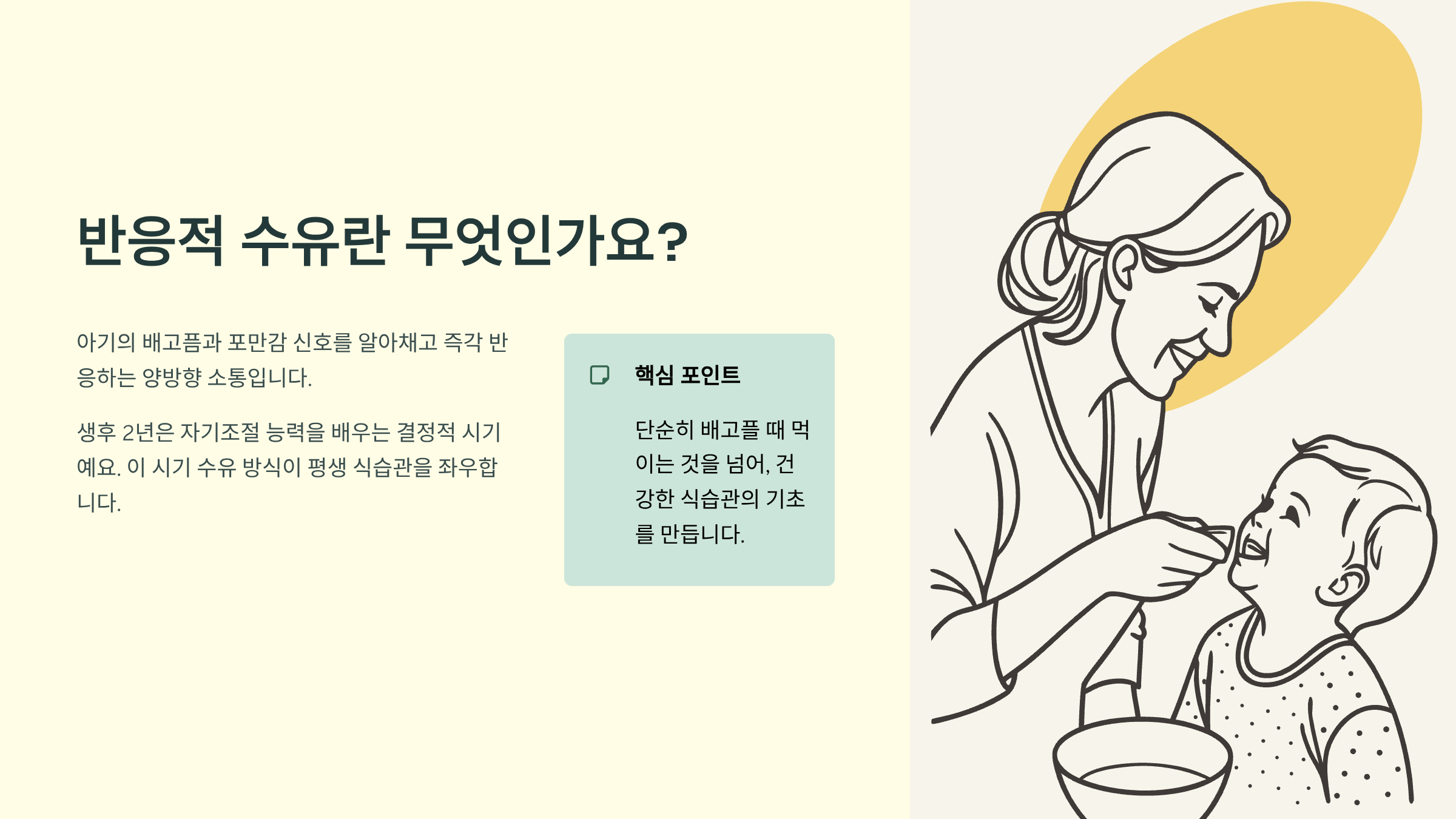 생후 2년은 아기가 자기조절 능력을 배우는 결정적 시기예요. 이 시기에 어떻게 수유하느냐가 아이의 평생 식습관을 좌우한다고 하니, 정말 중요하죠?