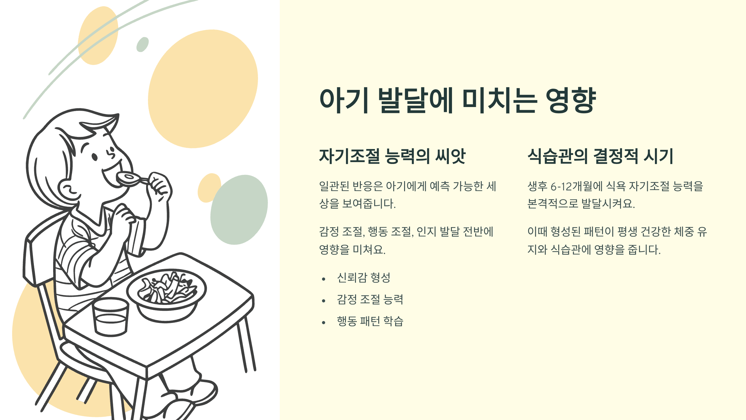 이 시기에 아기들은 식욕 자기조절 능력을 본격적으로 발달시켜요. 이때 형성된 패턴이 평생 건강한 체중 유지와 식습관에 영향을 준답니다.