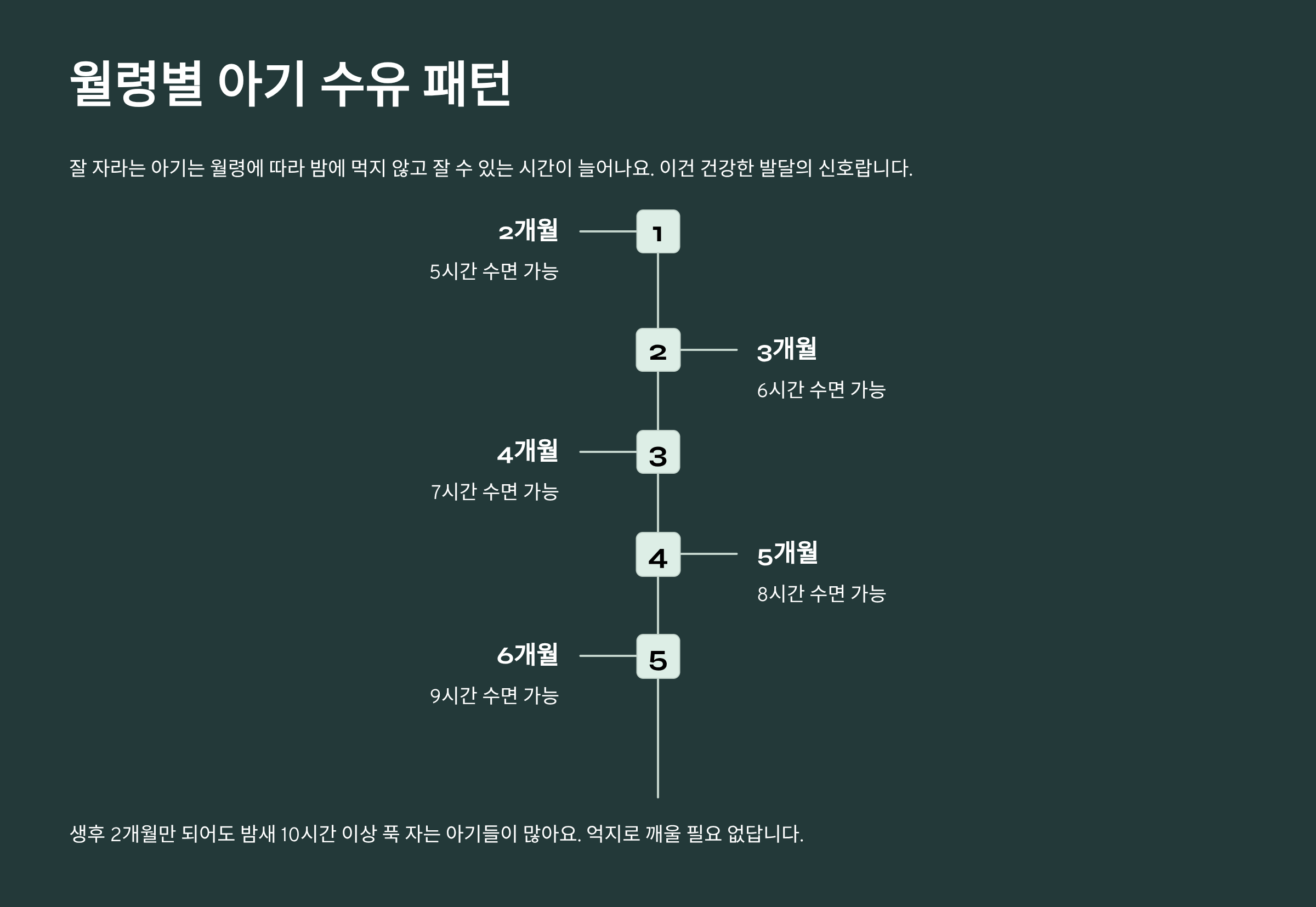 생후 4~5개월부터는 야간 수유가 자연스럽게 없어지는 시기예요. 단계적으로 수유 간격을 조정해서 밤중수유를 서서히 줄여나가는 게 좋아요.